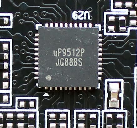 Однако если у карты Gigabyte на RTX 2080 схема питания ядра построена на базе 8-фазного цифрового преобразователя iMon DrMOS, то в данном случае она урезана до 6 фаз. Тем не менее, такая динамическая система управления питанием способна осуществлять мониторинг тока чаще раза в миллисекунду, что дает жесткий контроль над поступающим на ядро питанием и помогает GPU дольше работать на повышенных частотах. Схема управляется ШИМ-контроллером uP9512 (uPI Semiconductor). Такой же контроллер установлен и для 2-фазной схемы питания микросхем памяти.