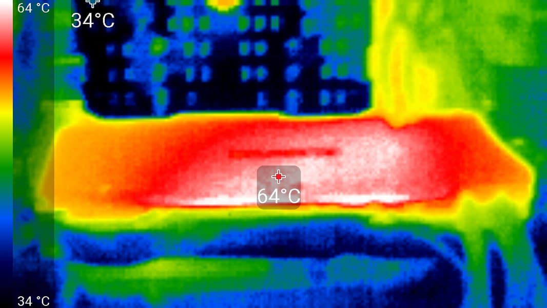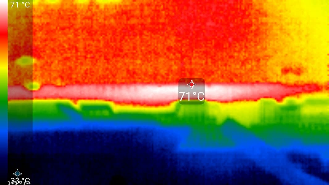 Максимальный нагрев — верхний край оборотной стороны PCB и области около преобразователей питания.