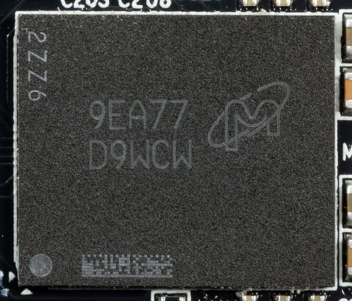 Карта имеет 8 ГБ памяти GDDR6 SDRAM, размещенной в 8 микросхемах по 8 Гбит на лицевой стороне PCB. Микросхемы памяти Micron (GDDR6, MT61K256M32JE-14) рассчитаны на номинальную частоту работы в 3500 (14000) МГц. Расшифровщик кодов на упаковках FBGA находится здесь.