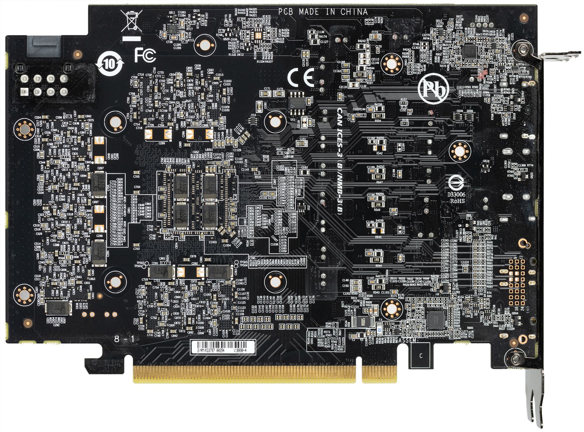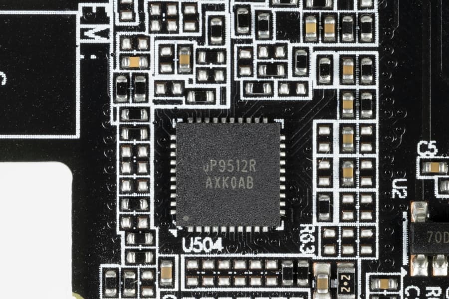 ШИМ-контроллер uP1666Q (uPI Semiconductor) контролирует две фазы питания 6 микросхем памяти. Контроллер расположен на тыльной стороне платы.