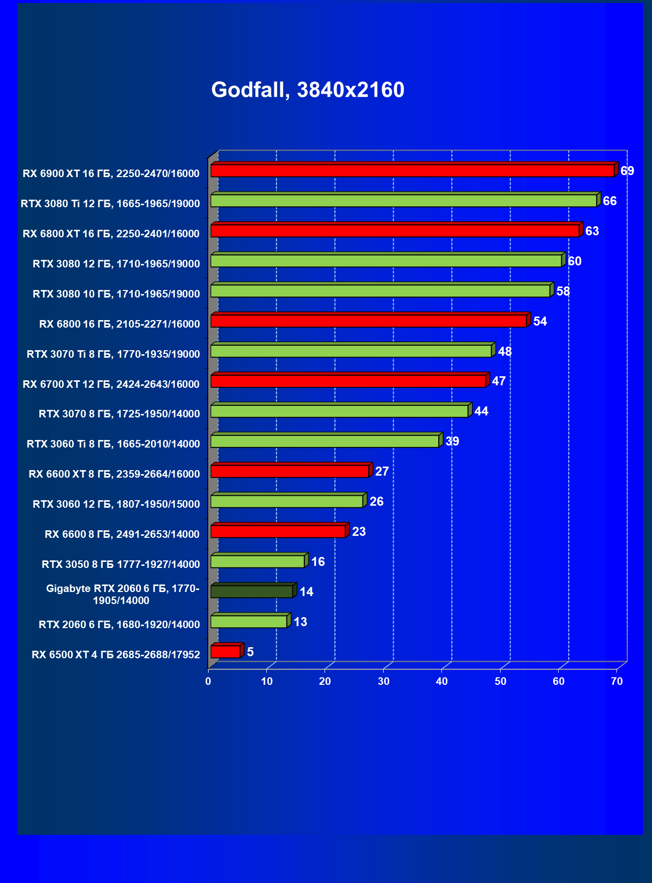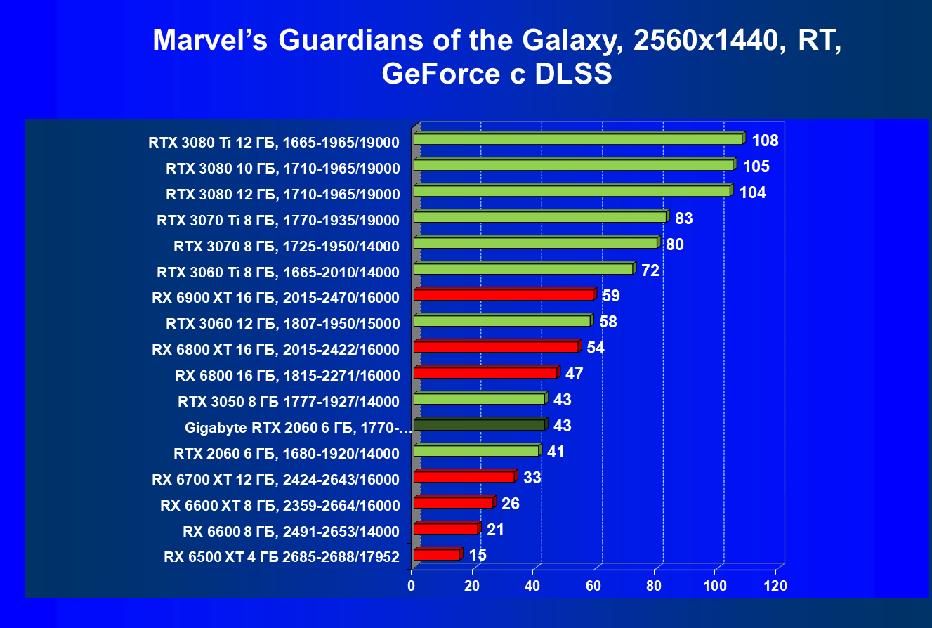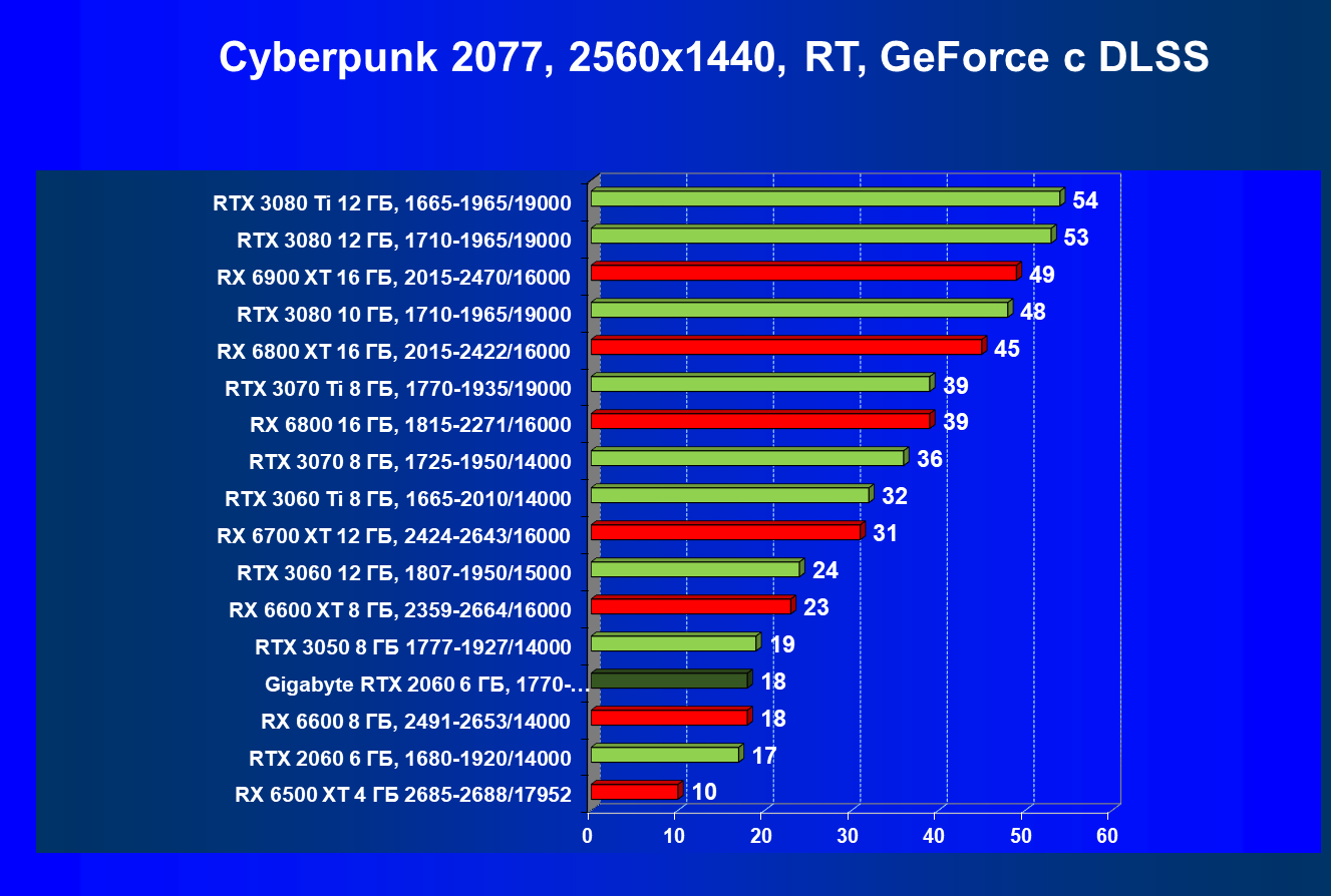 | 13 | RX 6600 (8 ГБ), 2491—2653/14000 | 180 | 31 | 59 000 |