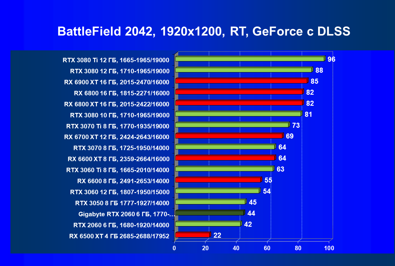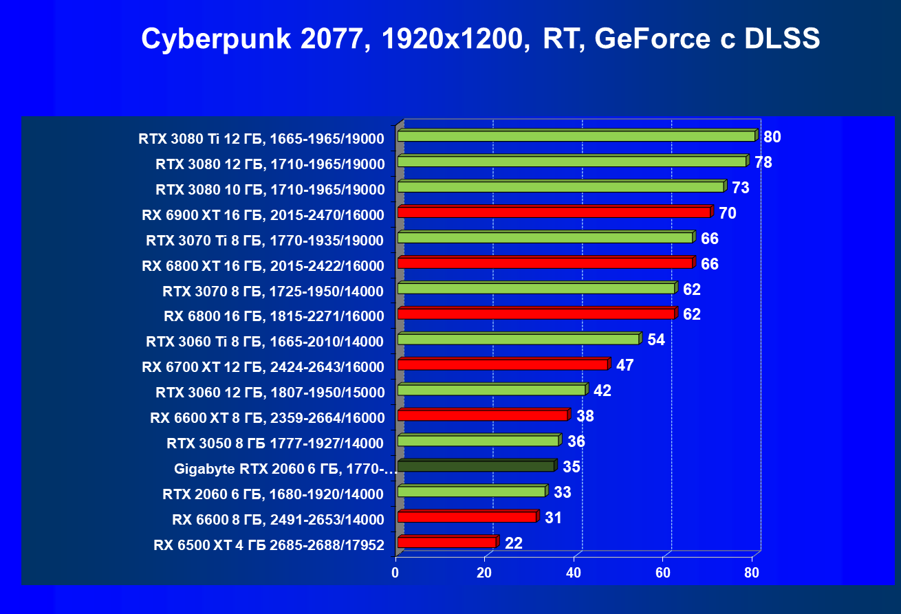 Хотя ускоритель GeForce RTX 2060 вышел в начале 2019 года, он по-прежнему сохраняет актуальность. В разрешении Full HD даже на ультра-настройках графики производительность приемлемая, обеспечивается возможность играть с трассировкой лучей и DLSS. Производительность в играх с трассировкой лучей у GeForce RTX 3050 и GeForce RTX 2060 довольно близка, однако на момент подготовки обзора приобрести GeForce RTX 3050 уже можно было чуть дешевле. А вот у Radeon RX 6500 XT включать трассировку лучей не рекомендуется, потому что провал в производительности огромный, даже несмотря на частичную компенсацию за счет FSR. Даже модель Radeon RX 6600, без включения RT более производительная, чем GeForce RTX 2060/3050, с трассировкой лучей уступает им.