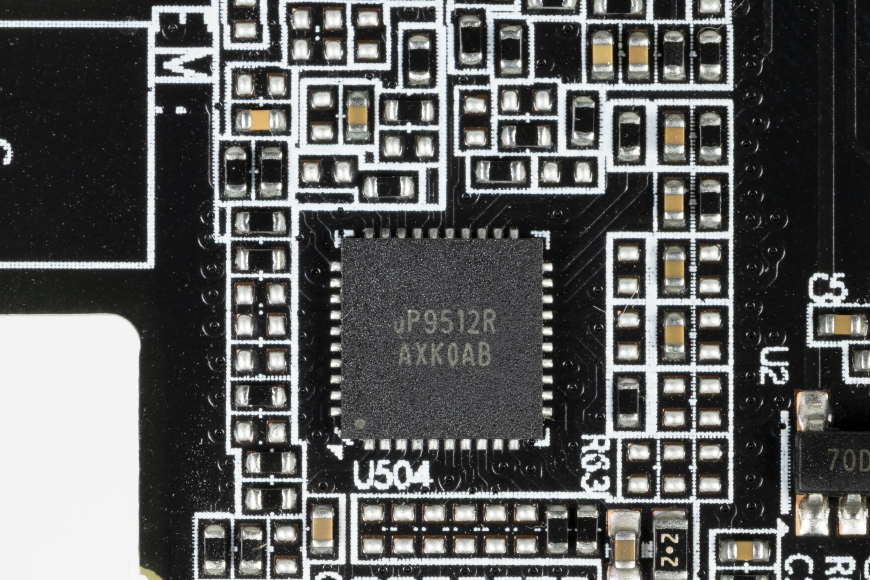 Зеленым цветом отмечена схема питания ядра (4 фазы), синим — памяти (2 фазы). Для управления питанием GPU используется ШИМ-контроллер uP9512R (uPI Semiconductor), который расположен на лицевой стороне платы.