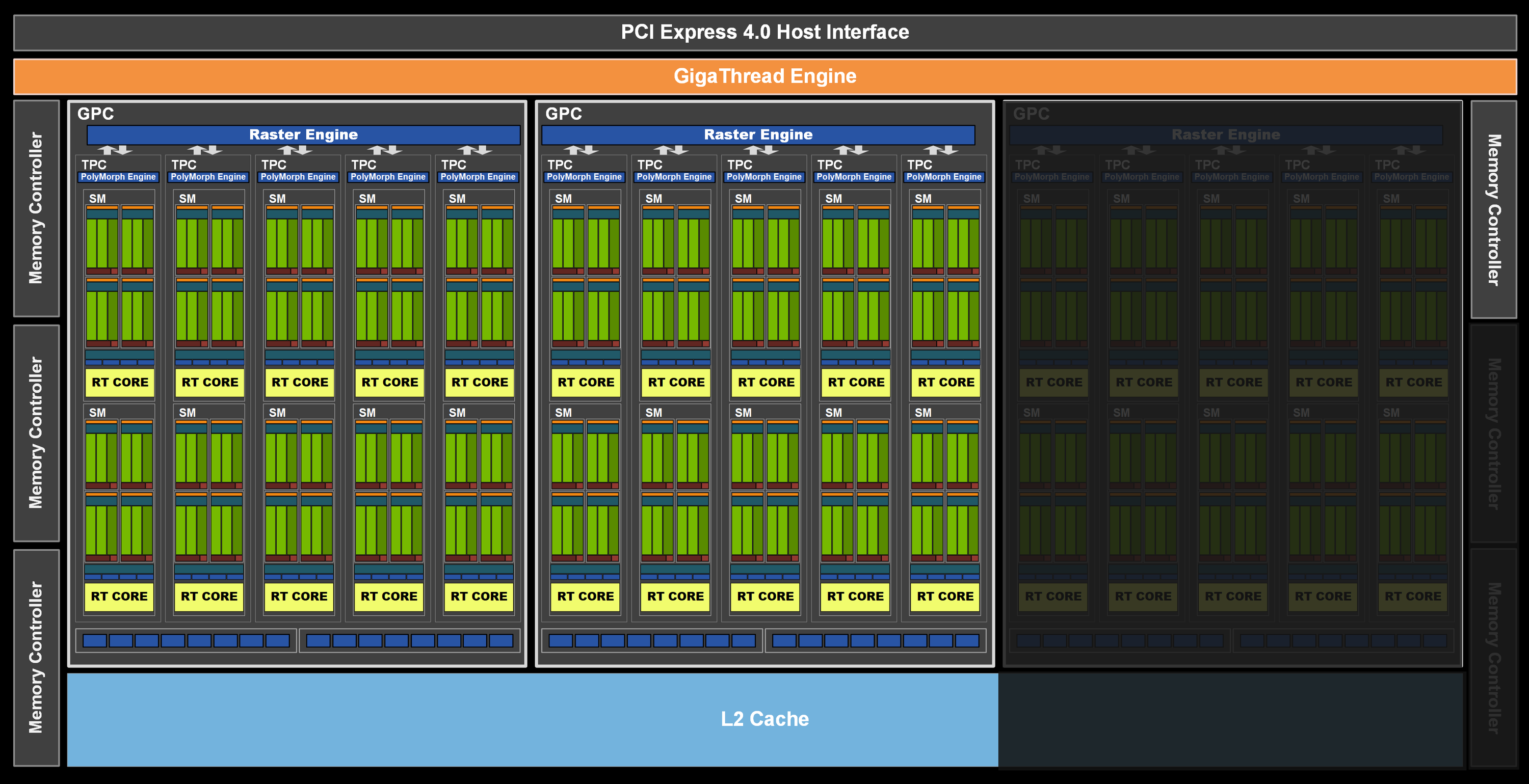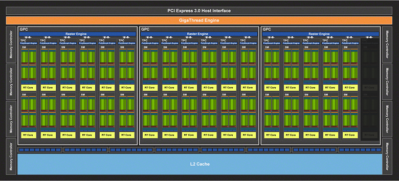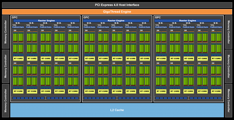 Полная версия графического процессора TU106 (у GeForce RTX 3060) содержит 3840 CUDA-ядер, 30 RT-ядер второго поколения и 120 тензорных ядер третьего поколения. Подсистема памяти этого GPU включает шесть 32-битных контроллеров, что дает общую ширину шины до памяти в 192 бита.