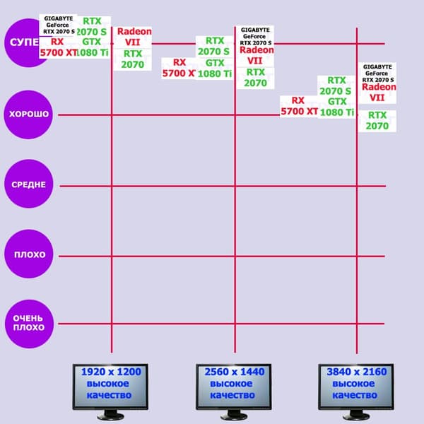 Наши многочисленные исследования показали, что Nvidia GeForce RTX 2070 тянет большинство игр при максимальных настройках качества в разрешениях до 2.5К включительно. Стоявший ранее на уровень выше GeForce RTX 2080 отлично чувствует себя в 2560×1440, а также может «замахнуться» на 4К при максимальном качестве графики в ряде игр, а «вклинившийся» между ними новый GeForce RTX 2070 Super также отлично подходит для разрешения 2.5К, но чтобы комфортно играть в 4К, во многих особо сложных по графике играх, возможно, придется ухудшить качество — либо вернуться в 2.5К ради сохранения максимального качества графики.