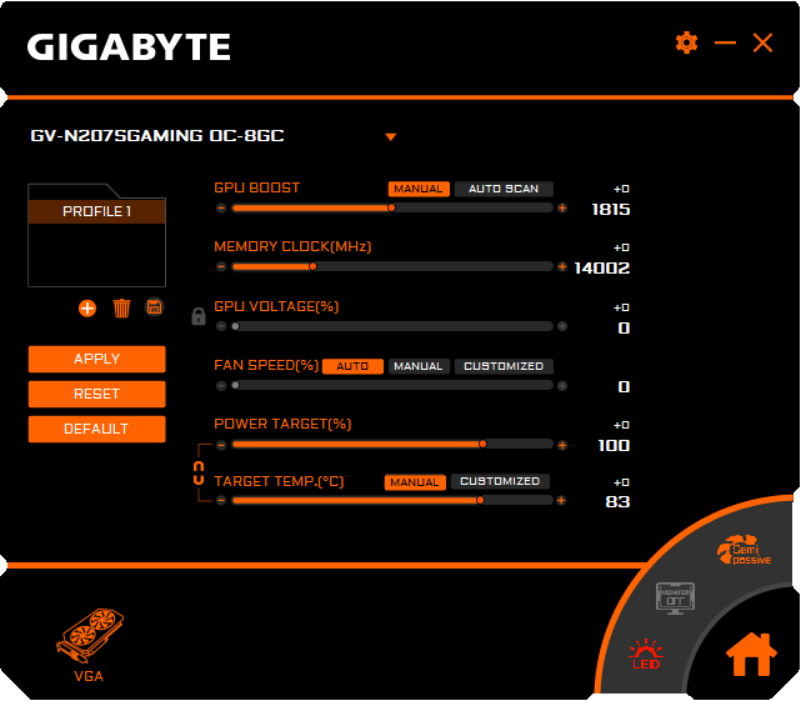 Управление работой карты обеспечивается с помощью фирменной утилиты Aorus Engine, о которой мы многократно писали. Ускоритель Gigabyte GeForce RTX 2070 Super Gaming OC немного разогнан в фабричных условиях, однако не позиционируется для оверклокеров и вряд ли заинтересует фанатов серьезного разгона. Специальных режимов с различающимися частотами нет, только номинальный, поэтому утилита предлагает только одну вкладку для ручного разгона.