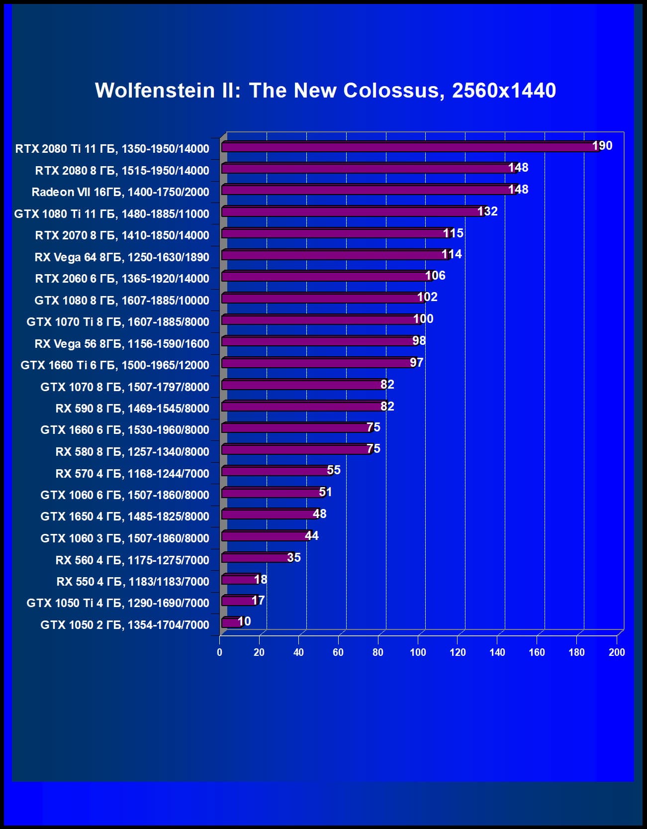 Рейтинг ускорителей iXBT.com демонстрирует нам функциональность видеокарт друг относительно друга и нормирован по самому слабому ускорителю — Radeon RX 550 (то есть сочетание скорости и функций RX 550 приняты за 100%). Рейтинги ведутся по 22 ежемесячно исследуемым нами акселераторам в рамках проекта Лучшая видеокарта месяца. Из общего списка выбирается группа карт для анализа, куда входят RTX 2080 Ti и его конкуренты. Учитывая, что ускоритель такого класса явно не предназначен для использования в разрешении 1920×1200 и ниже, мы в данном случае приводим рейтинги только для разрешений 2560×1440 и 3840×2160.