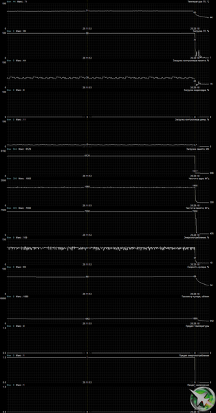 После 6-часового прогона под нагрузкой максимальная температура ядра не превысила 71 градус, что является отличным результатом для видеокарты такого уровня.
