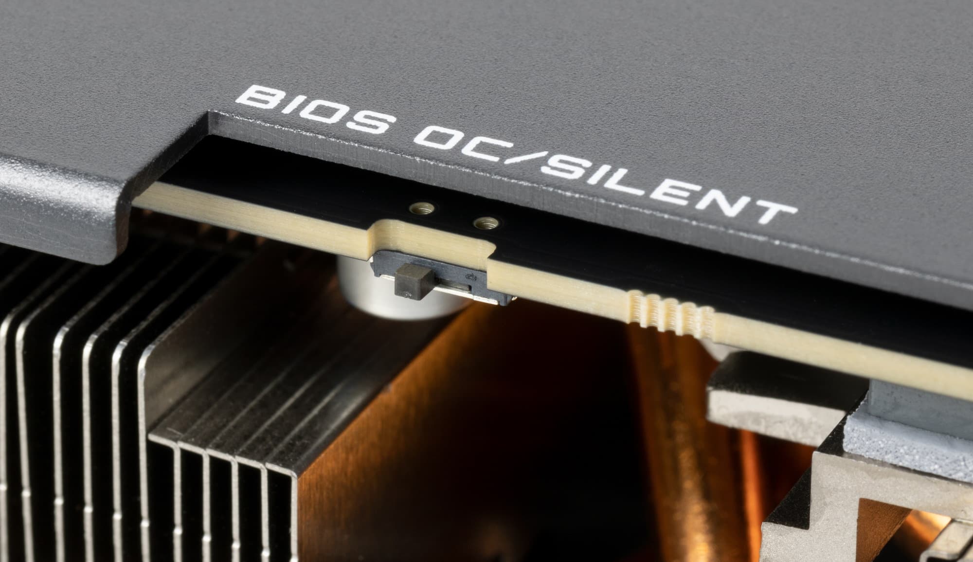 Карта имеет два режима работы, они заложены в двух вариантах BIOS, которые переключаются с помощью переключателя на верхнем торце карты: OC и Silent. Разница между режимами заключается, по сути, только в оборотах вентиляторов, а предел энергопотребления для обеих версий BIOS заложен в 350 Вт.
