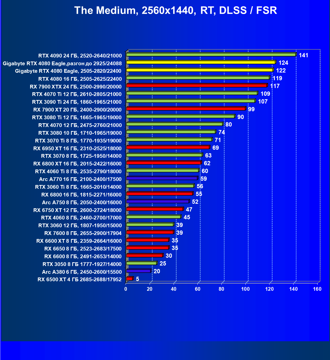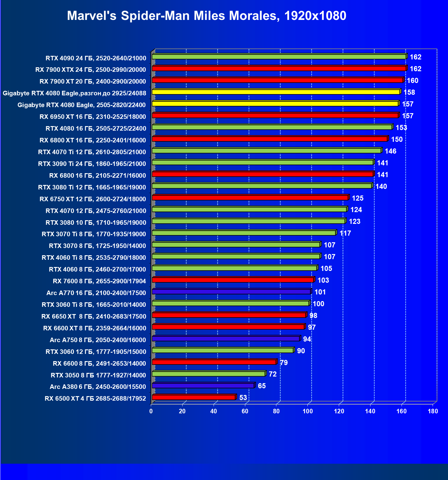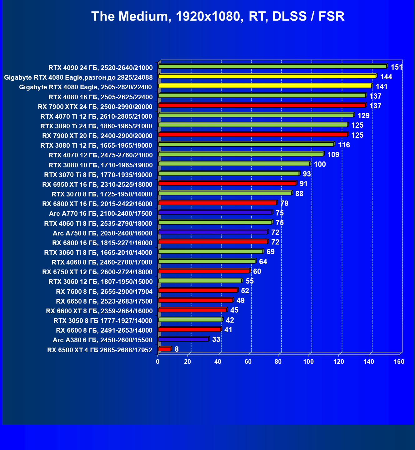 В классических играх тишь да гладь: все логично согласно многочисленным тестам, проведенным не один раз: выигрывает Radeon RX 7900 XTX, который по цене почти равен RTX 4080 (чуть дешевле).