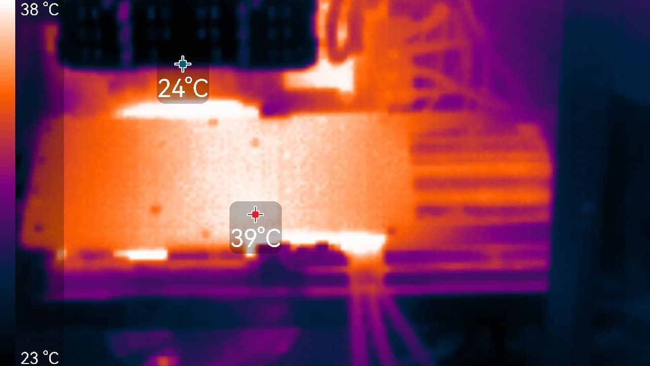 В режиме простоя в 2D в обоих режимах BIOS температура была не выше 38 °C, вентиляторы не работали, уровень шума был равен фоновому — 18 дБА.