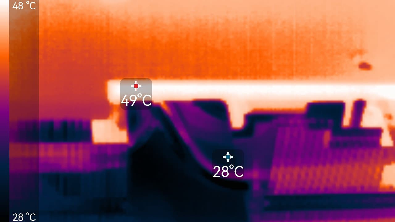 В режиме максимальной нагрузки в 3D температура достигала 72/62 °C (ядро/память). Вентиляторы при этом раскручивались до 1400 оборотов в минуту, шум вырастал лишь до 31,6 дБА: это отчетливо слышно, но не громко.