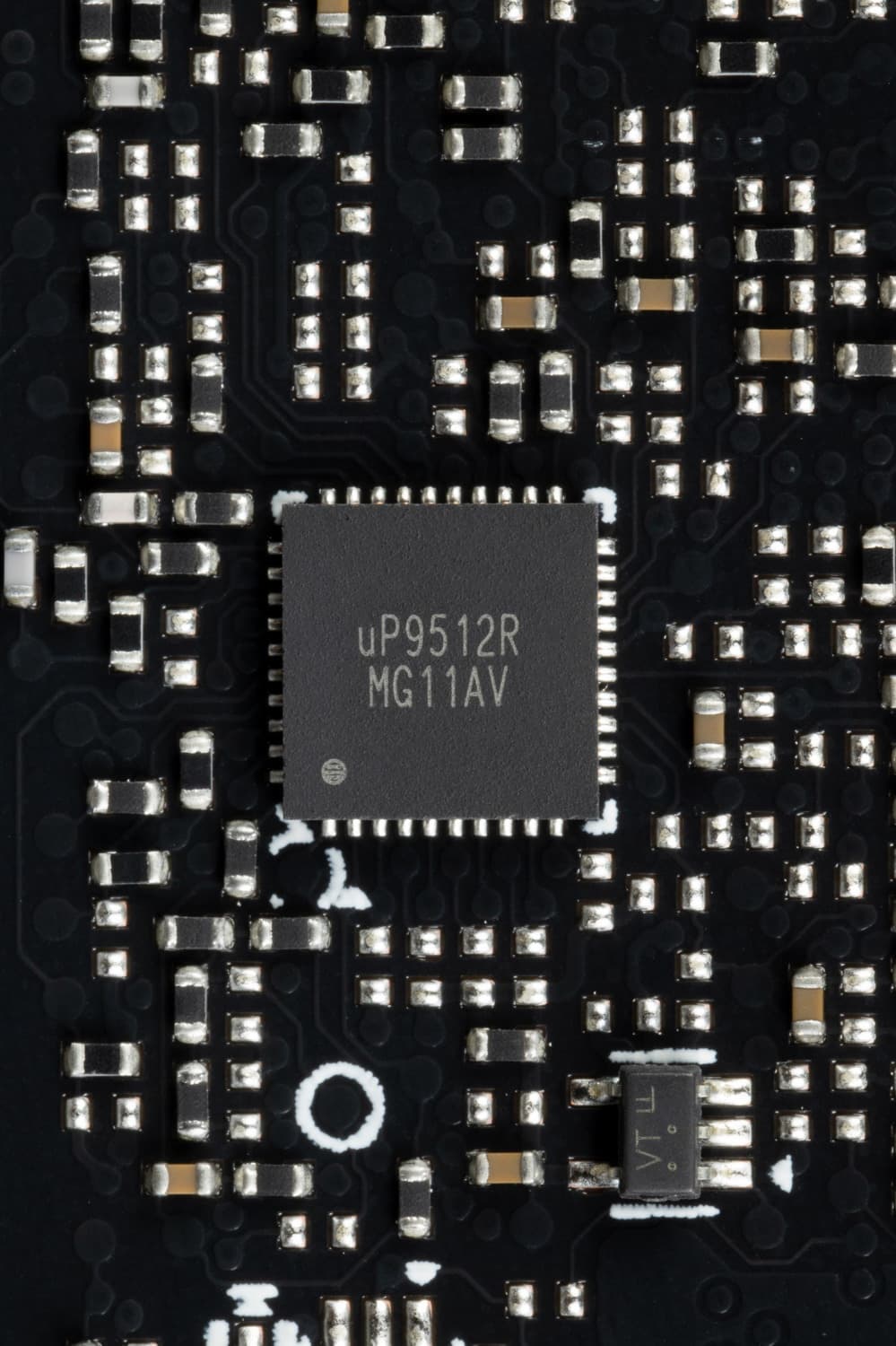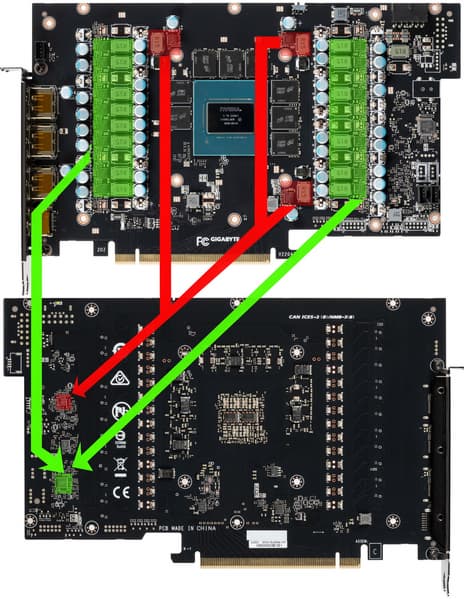 Зеленым цветом отмечена схема питания ядра, красным — памяти. Все контроллеры расположены на оборотной стороне PCB. Фазами питания ядра управляет ШИМ-контроллер uP9512R (максимум 8—12 фаз в зависимости от модификации).