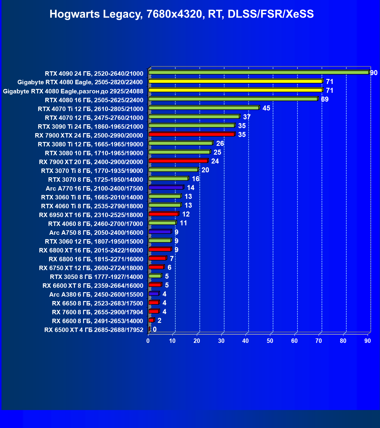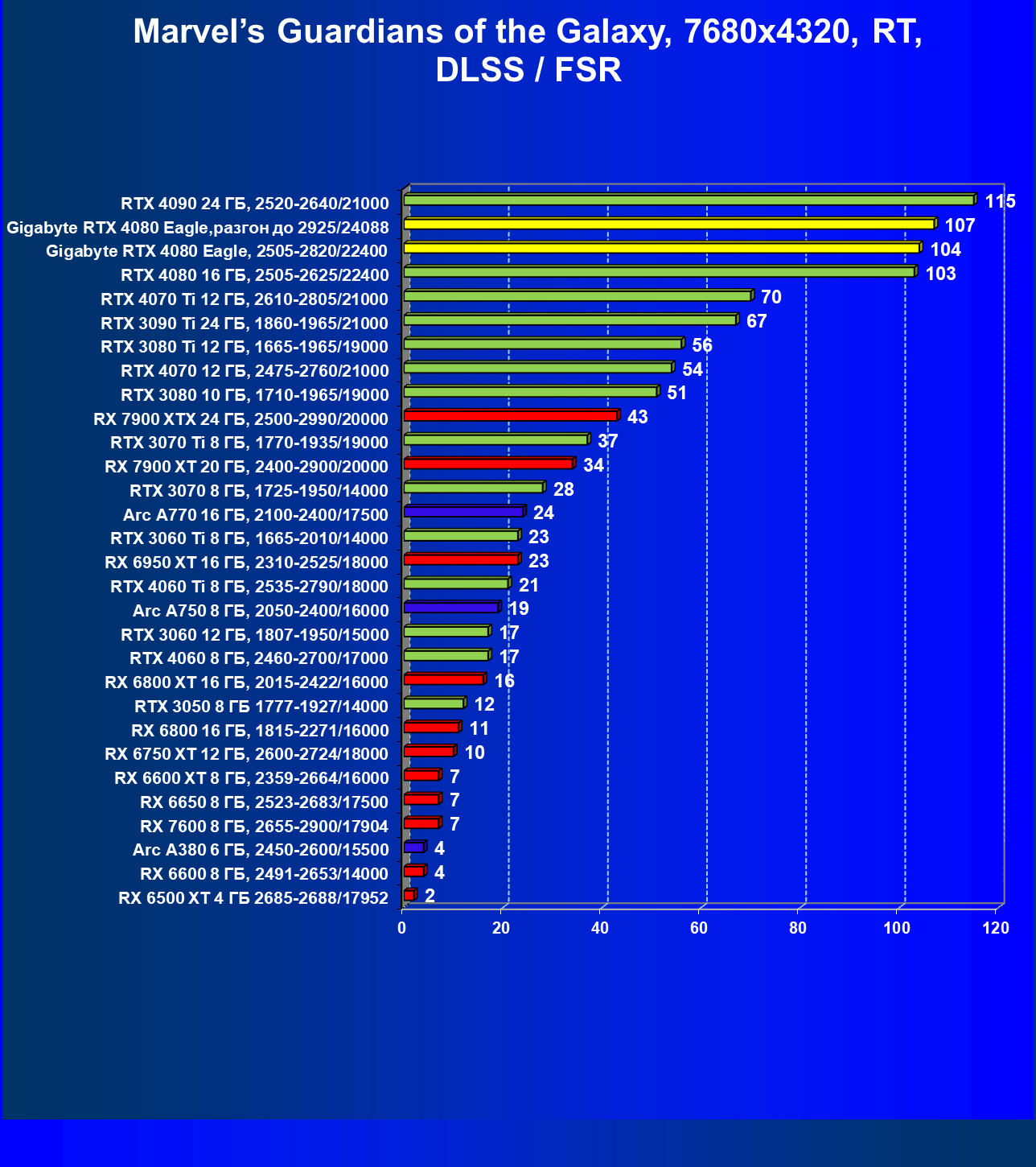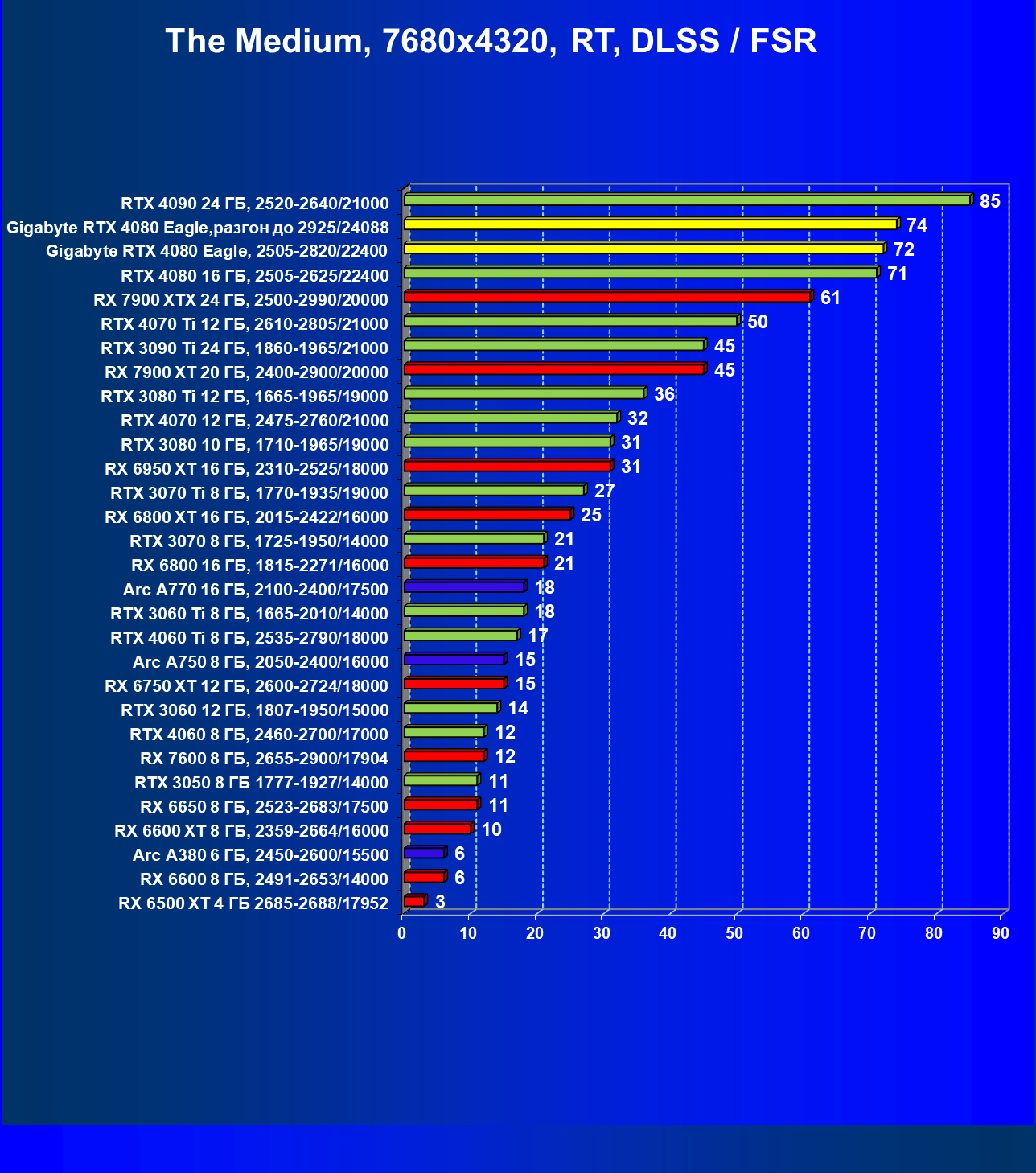 - Результаты тестов с включенной аппаратной трассировкой лучей и DLSS/FSR/XeSS в разрешении 7680×4320 (8К)