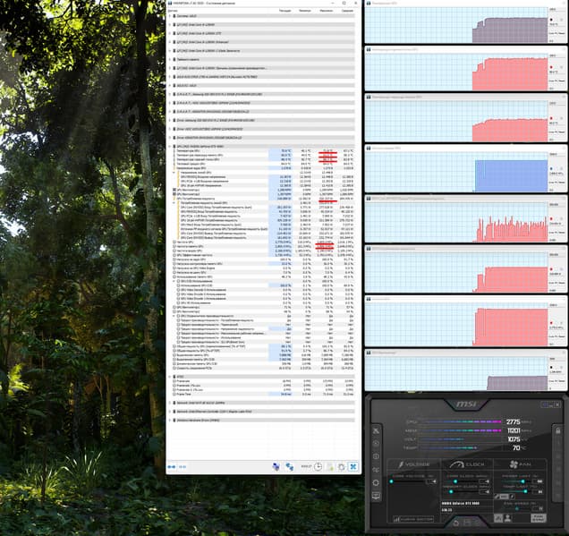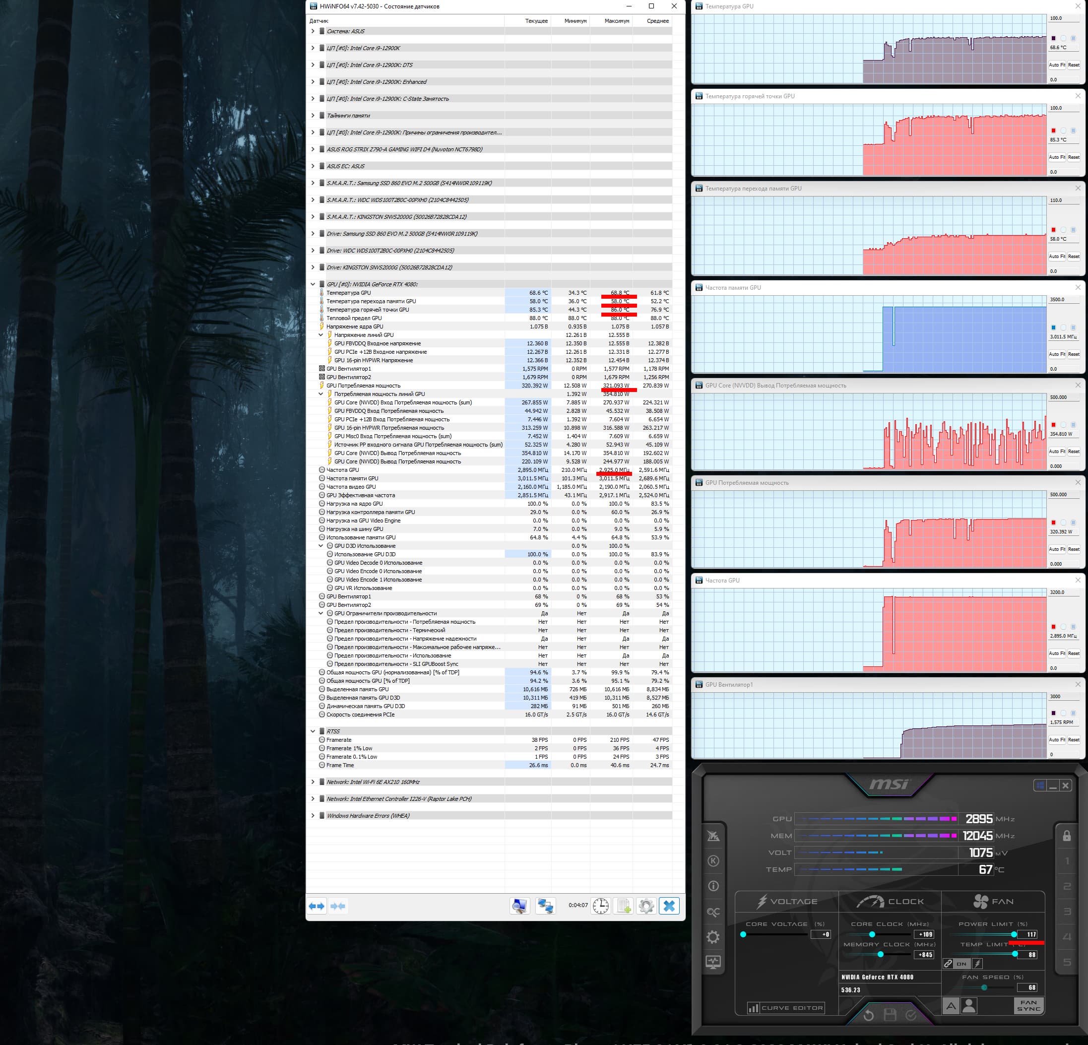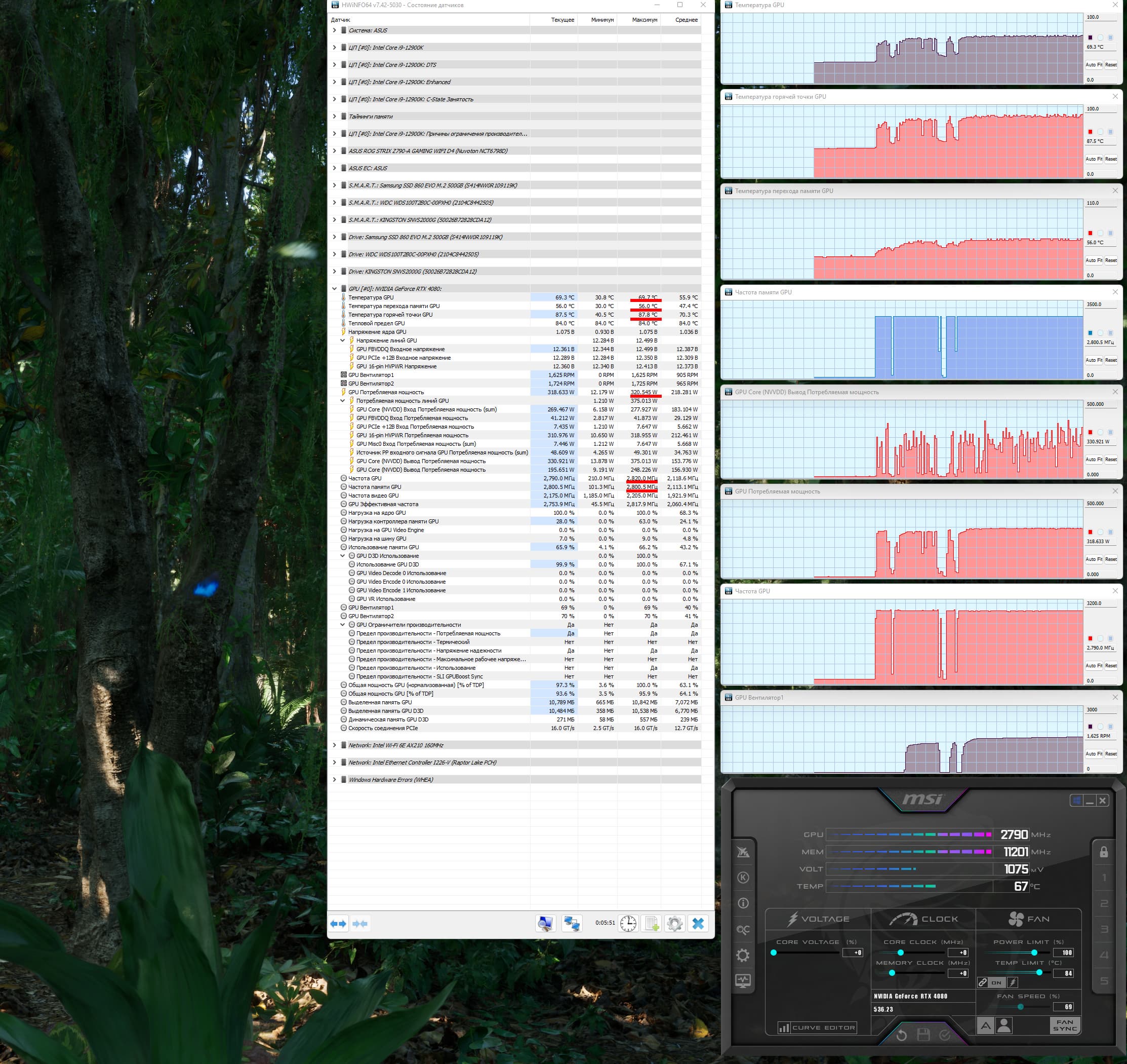 Я попробовал ручной разгон при повышении лимита потребления до 117% и получил максимальные частоты 2925/24088 МГц, однако даже при таком повышенном лимите потребления прирост в играх в разрешении 4K в среднем составил всего 3,5% относительно референсных значений (драйвера Nvidia не позволяют сильно поднять реальный предел потребления). Энергопотребление карты почти не выросло.