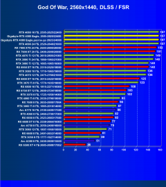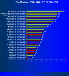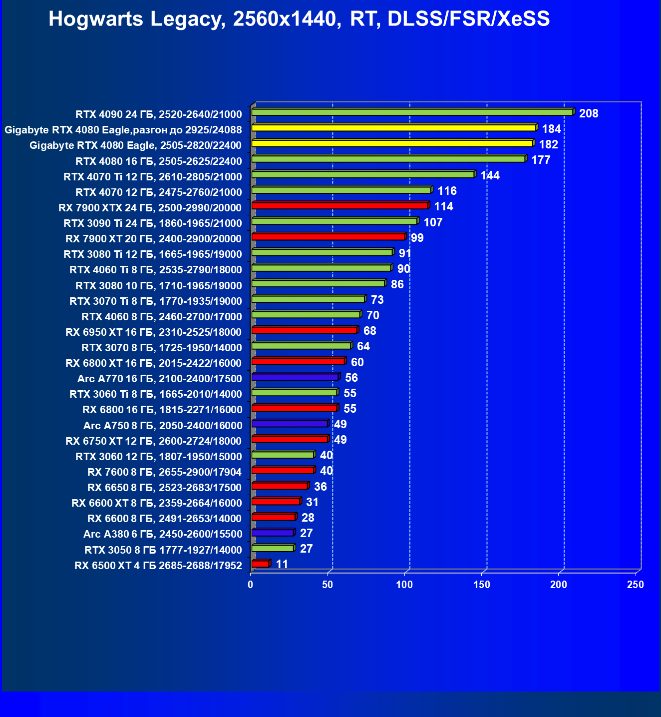 - Результаты тестов со включенной аппаратной трассировкой лучей и/или DLSS/FSR/XeSS в разрешениях 1920×1080, 2560×1440 и 3840×2160