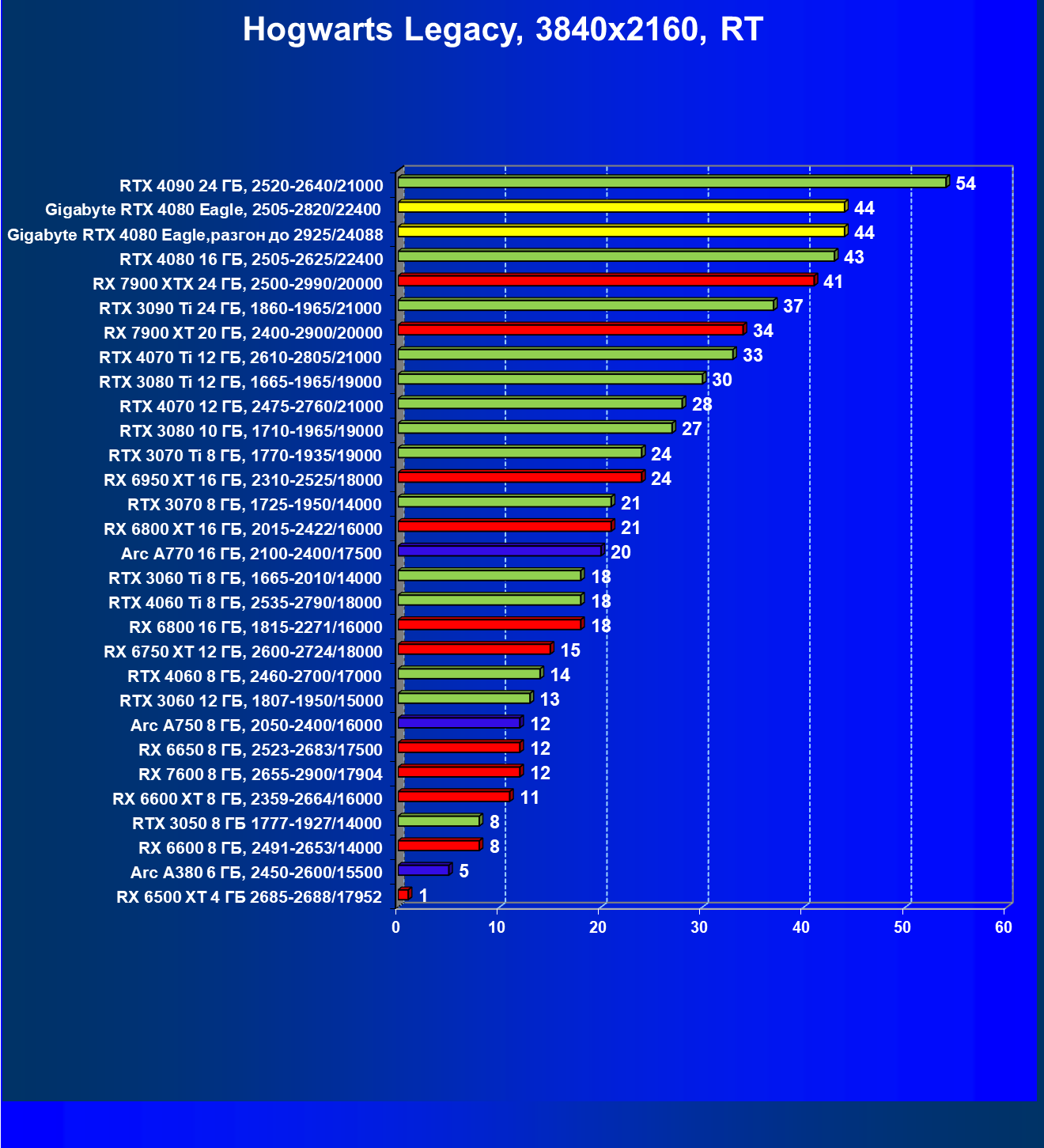 | 18 | RX 7900 XT 20 ГБ, 2400—2900/20000 | 168 | 1429 | 85 000 |