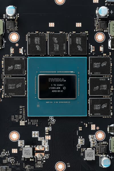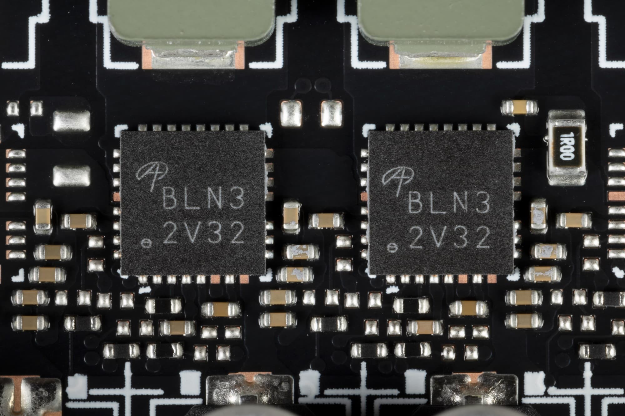 В преобразователе питания, традиционно для всех видеокарт Nvidia, используются транзисторные сборки DrMOS — в данном случае AOZ5311 (Alpha&Omega Semiconductor), каждая из которых рассчитана максимально на 55 А.