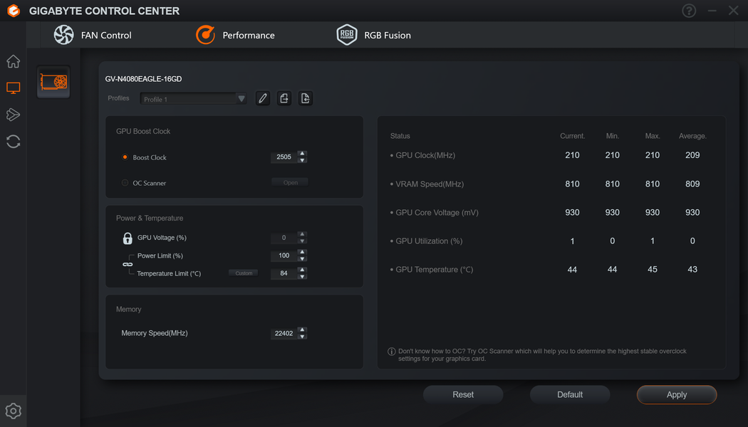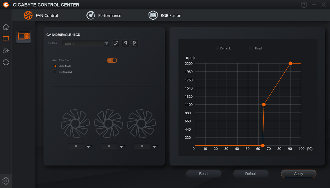 Управление работой карты обеспечивается с помощью фирменной утилиты Gigabyte Center, мы о ней уже ранее писали: программа предоставляет управление вентиляторами, частотами работы карты, напряжением ядра и слежение за состоянием карты (мониторинг).