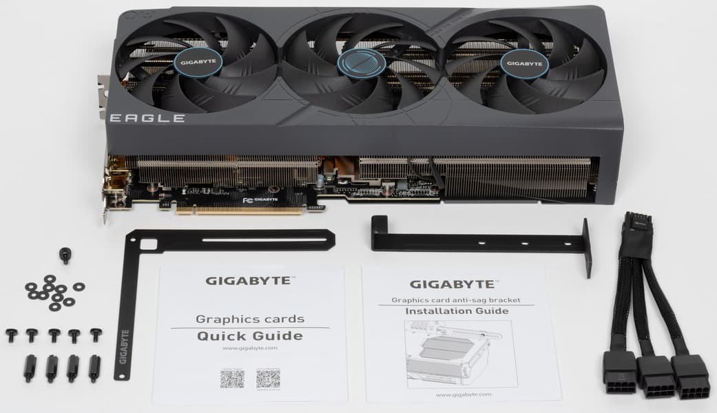 Карта Gigabyte имеет стандартный 16-контактный разъем питания версии PCIe 5.0. Несмотря на то, что в комплекте поставки имеется адаптер-переходник для подключения разъемов питания типа PCIe 2.0 (на 3 таких разъема), лучше все же использовать блоки питания стандарта ATX 3.0 с полноценной поддержкой питания стандарта PCIe 5.0 (с кабелем 12VHPWR). Имеющийся же переходник питания ни в коем случае нельзя изгибать непосредственно после 16-контактного разъема.