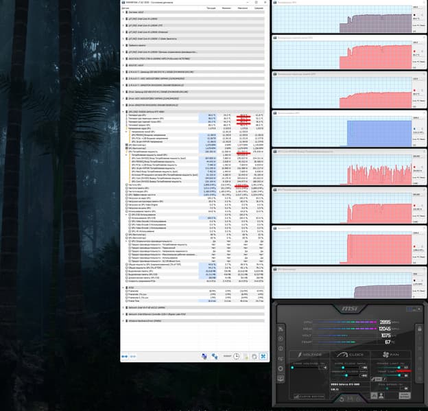 При ручном разгоне (режим BIOS OC) при выставлении лимита потребления в 117% параметры нагрева и шума менялись мало. Несмотря на поднятие лимита потребления, драйвера Nvidia не позволяли потреблению особо подниматься выше 320 Вт, поэтому частоты работы GPU в игровых тестах поднимались редко выше 2895 МГц.