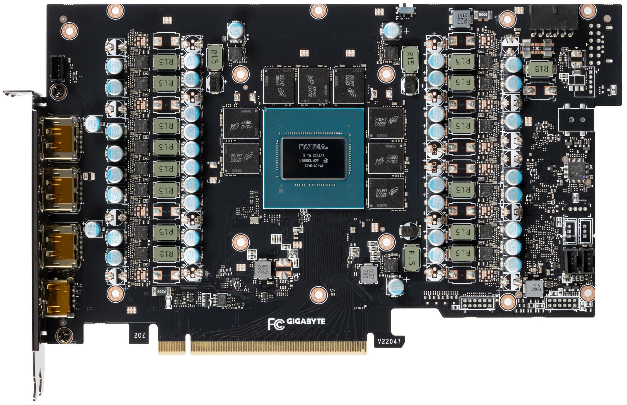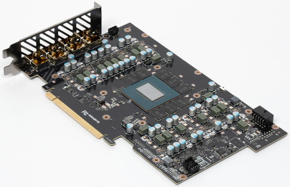 Для сравнения я взял видеокарту от того же производителя, которая идет как бы рангом выше из серии Gaming. Очевидно, что PCB у них общая. Полагаю, что и у топового продукта под суббрендом Aorus печатная плата точно такая же. Разница по сути только в комплектации фазами питания графического процессора.