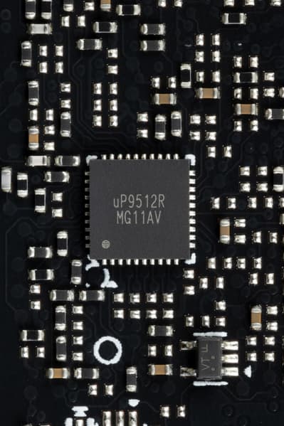 Также на тыльной стороне карты имеется контроллер uS5650Q (uPI Semi), который отвечает за мониторинг карты (отслеживание напряжений и температуры).