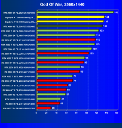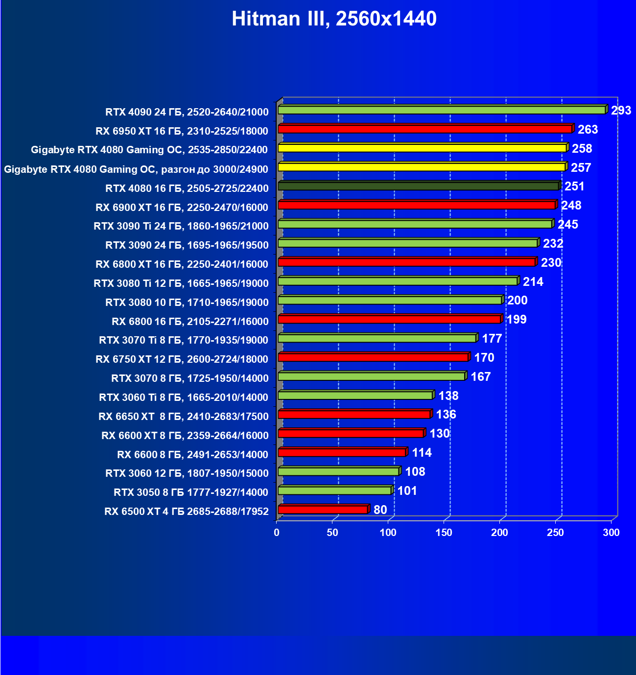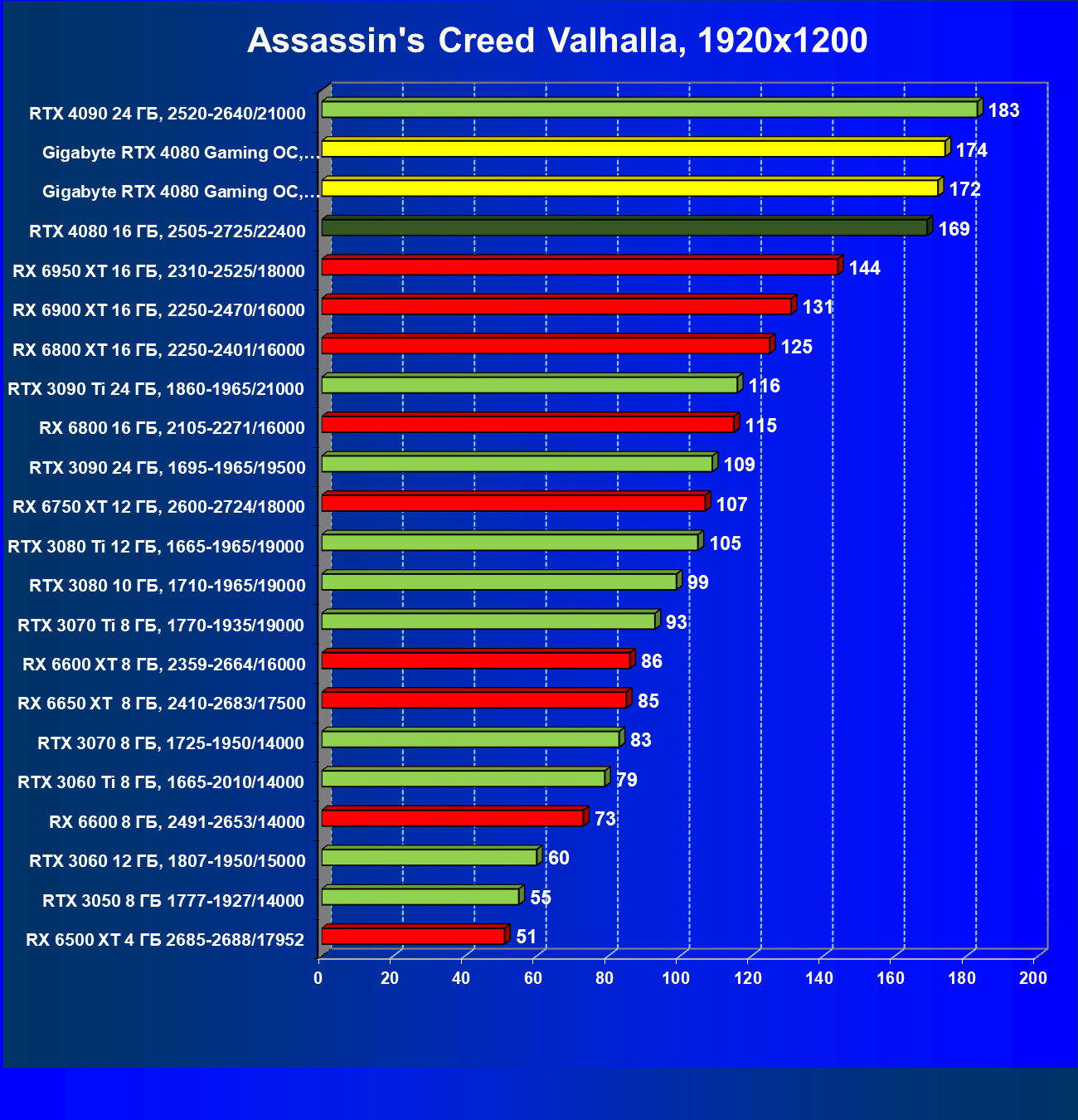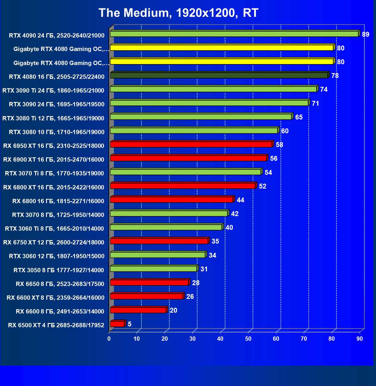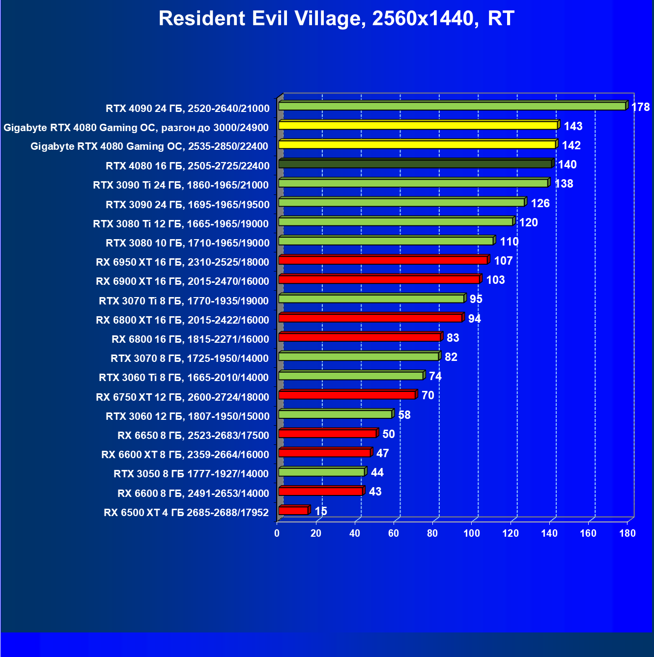 В данном случае преимущество RTX 4080 над флагманами AMD выражено еще более ярко. В среднем прирост производительности относительно RTX 3090 Ti по всем разрешениям составляет 14,5%, а в разрешении 4К — 17%. Карта Gigabyte за счет фабричного разгона опять же еще немного быстрее. Разница же в производительности с RX 6950 XT в данном случае составляет 35% по всем разрешениям и аж 58%(!) в 4К.