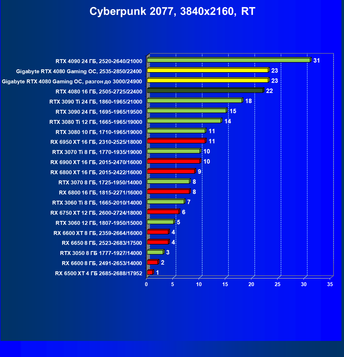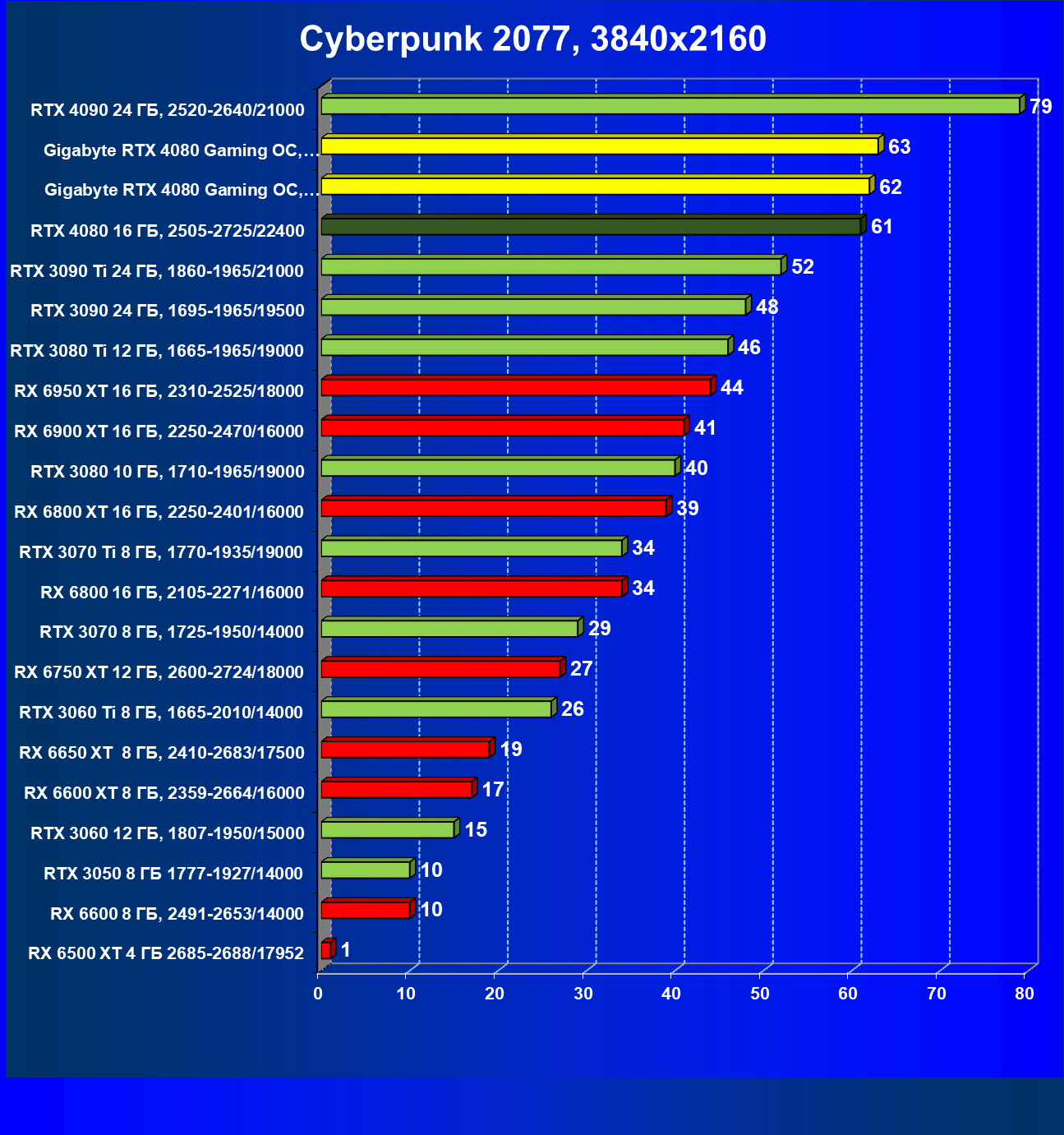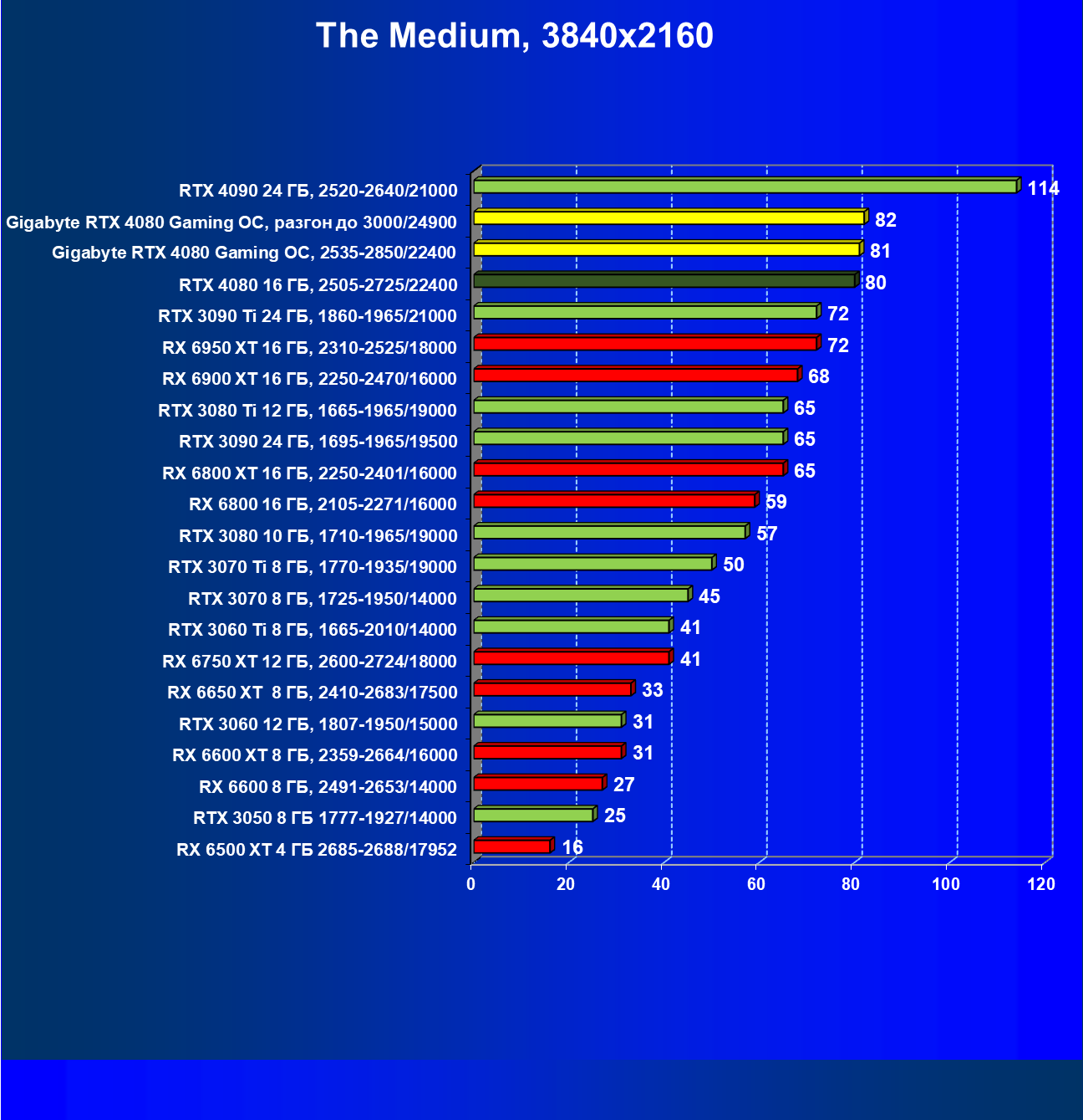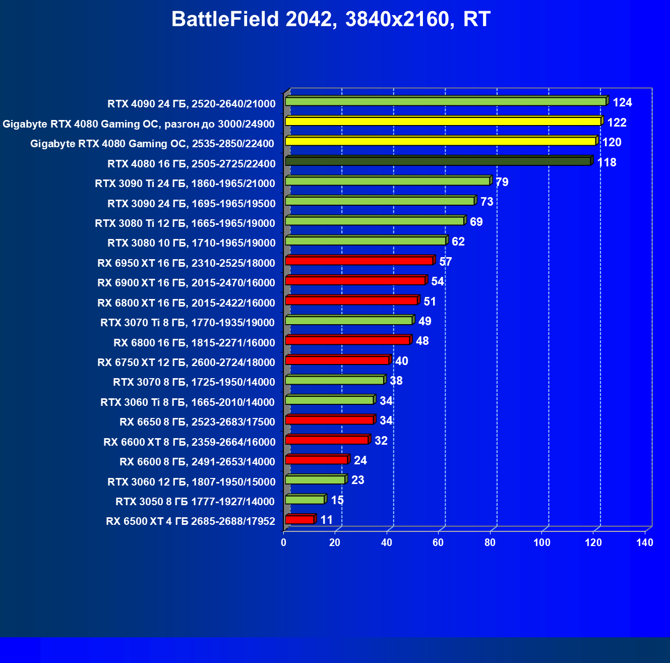 | 20 | Gigabyte RTX 4080 Gaming OC, 2535—2850/22400 | 71 | 837 | 118 000 |