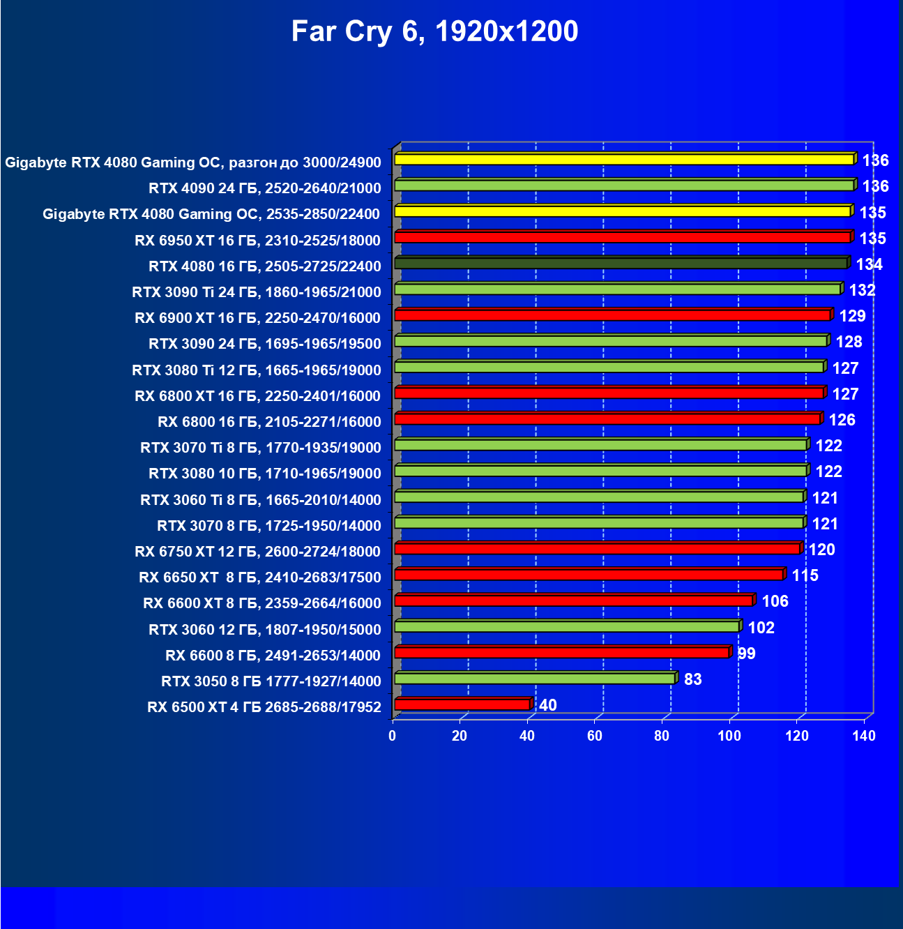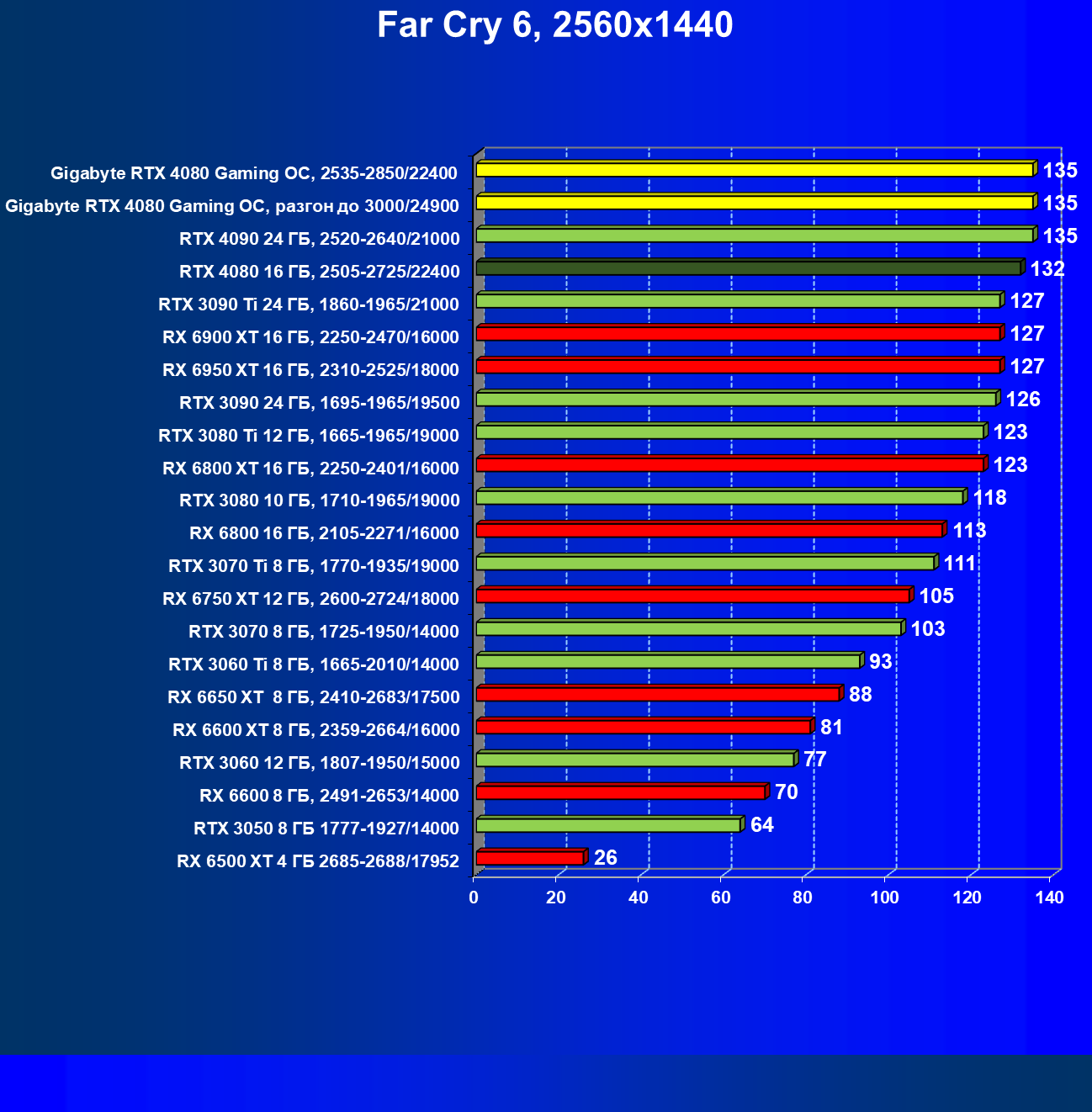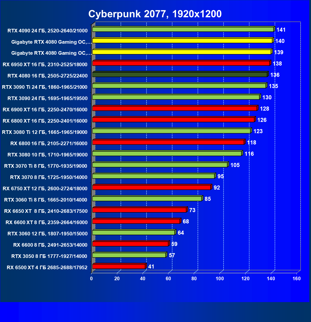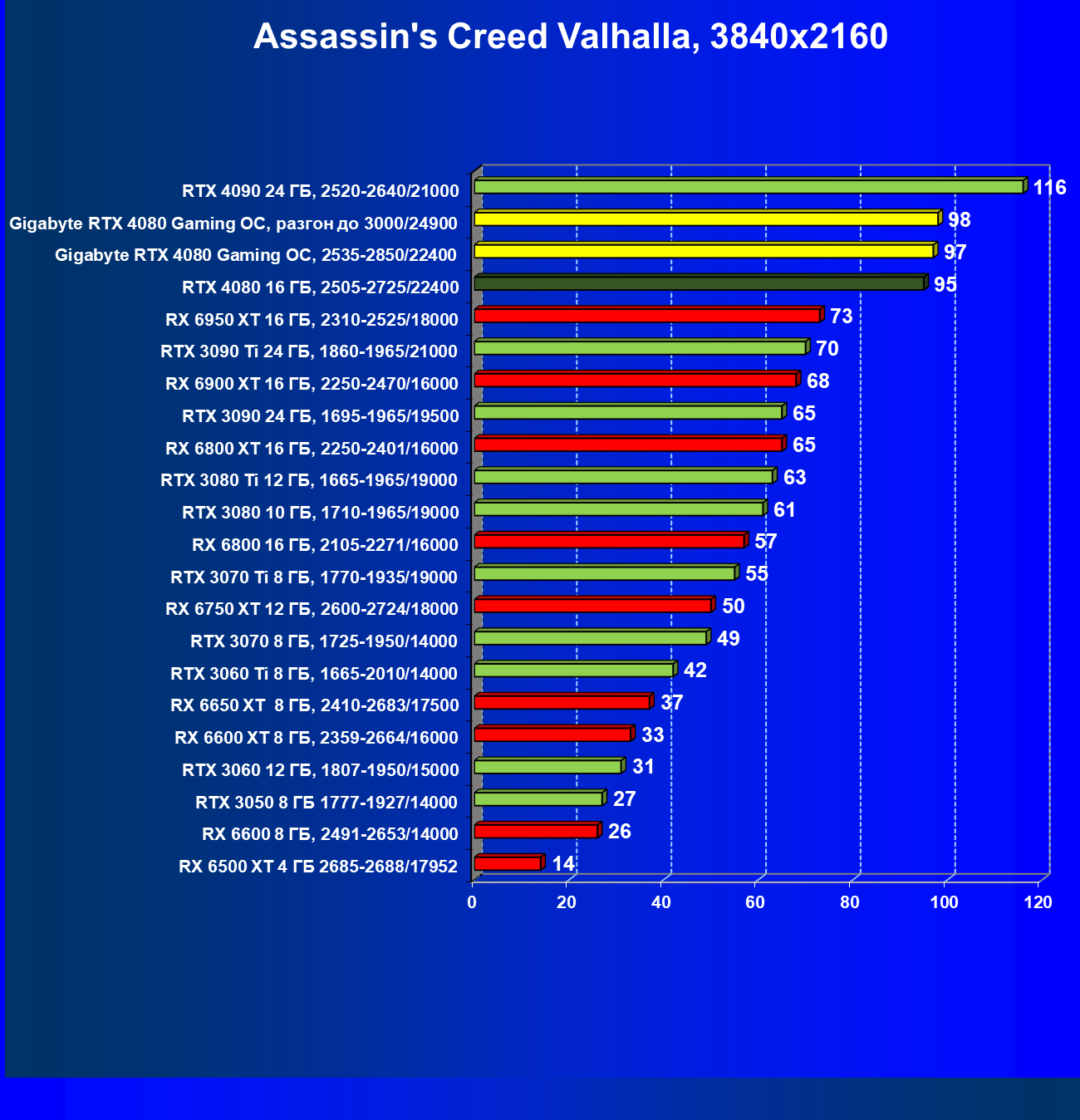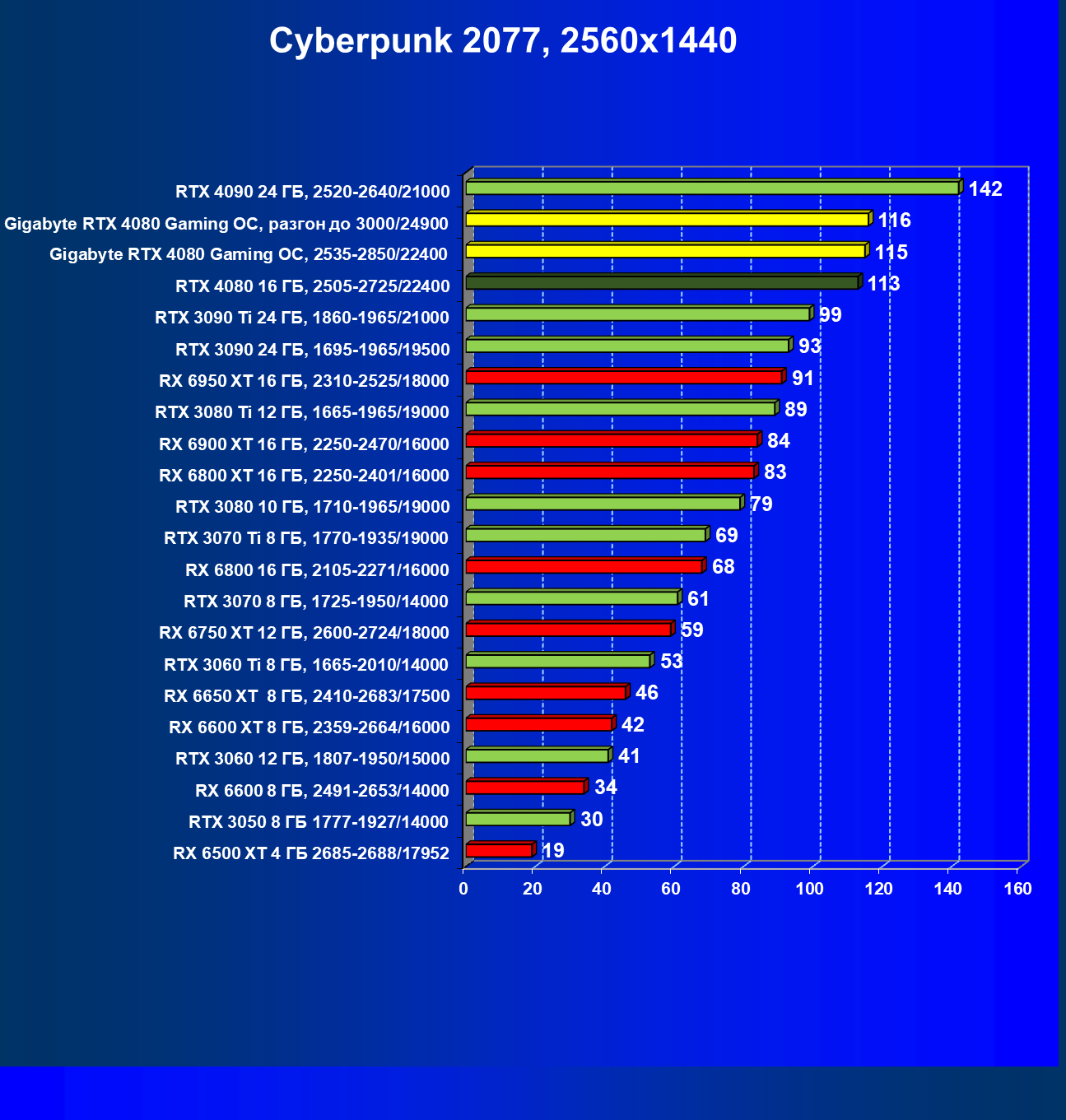 | 20 | Gigabyte RTX 4080 Gaming OC, 2535—2850/22400 | 71 | 837 | 118 000 |