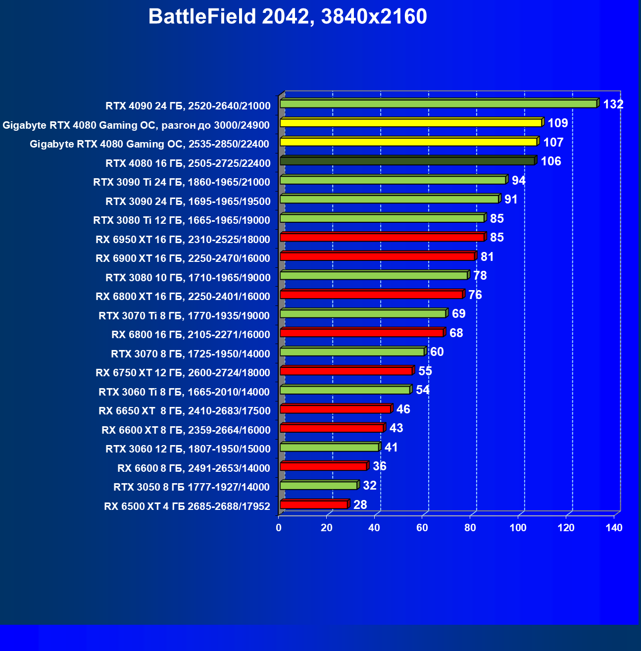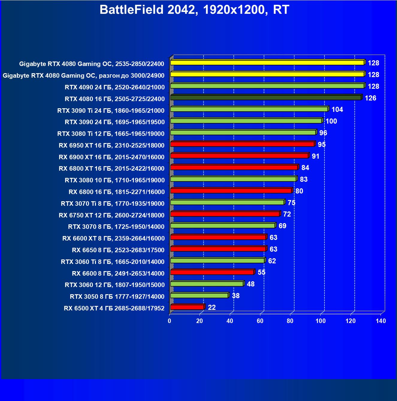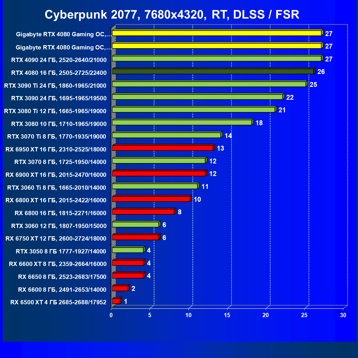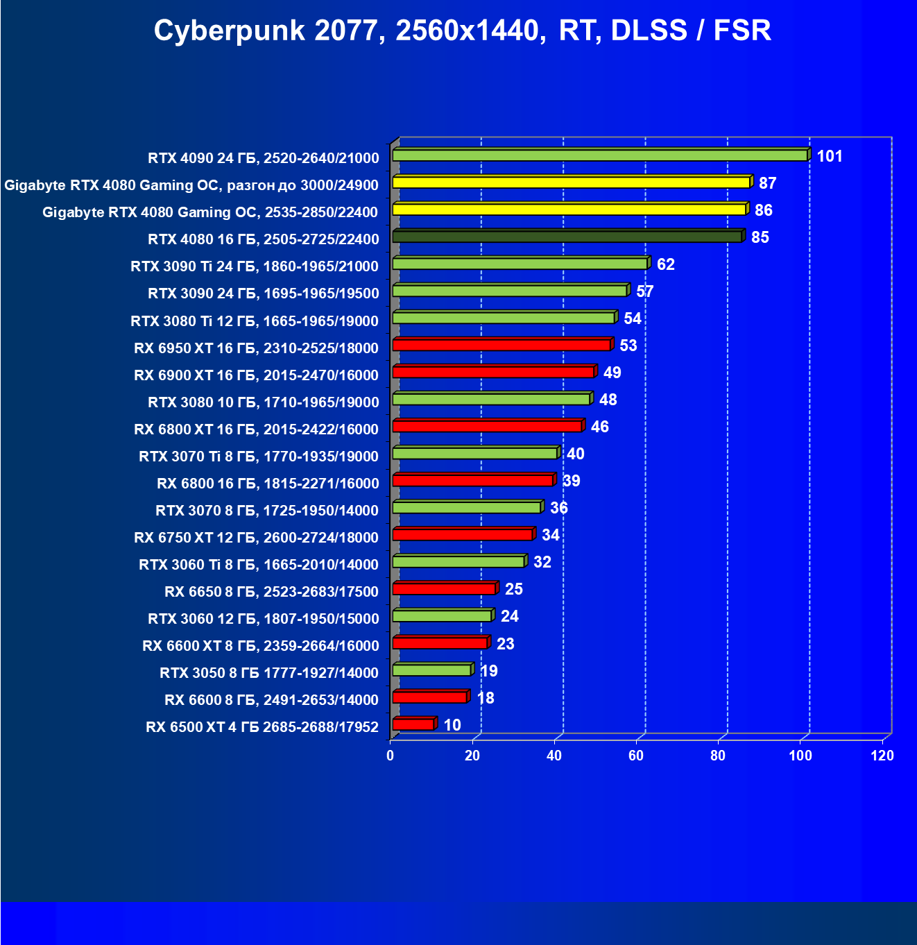 | 20 | Gigabyte RTX 4080 Gaming OC, 2535—2850/22400 | 71 | 837 | 118 000 |