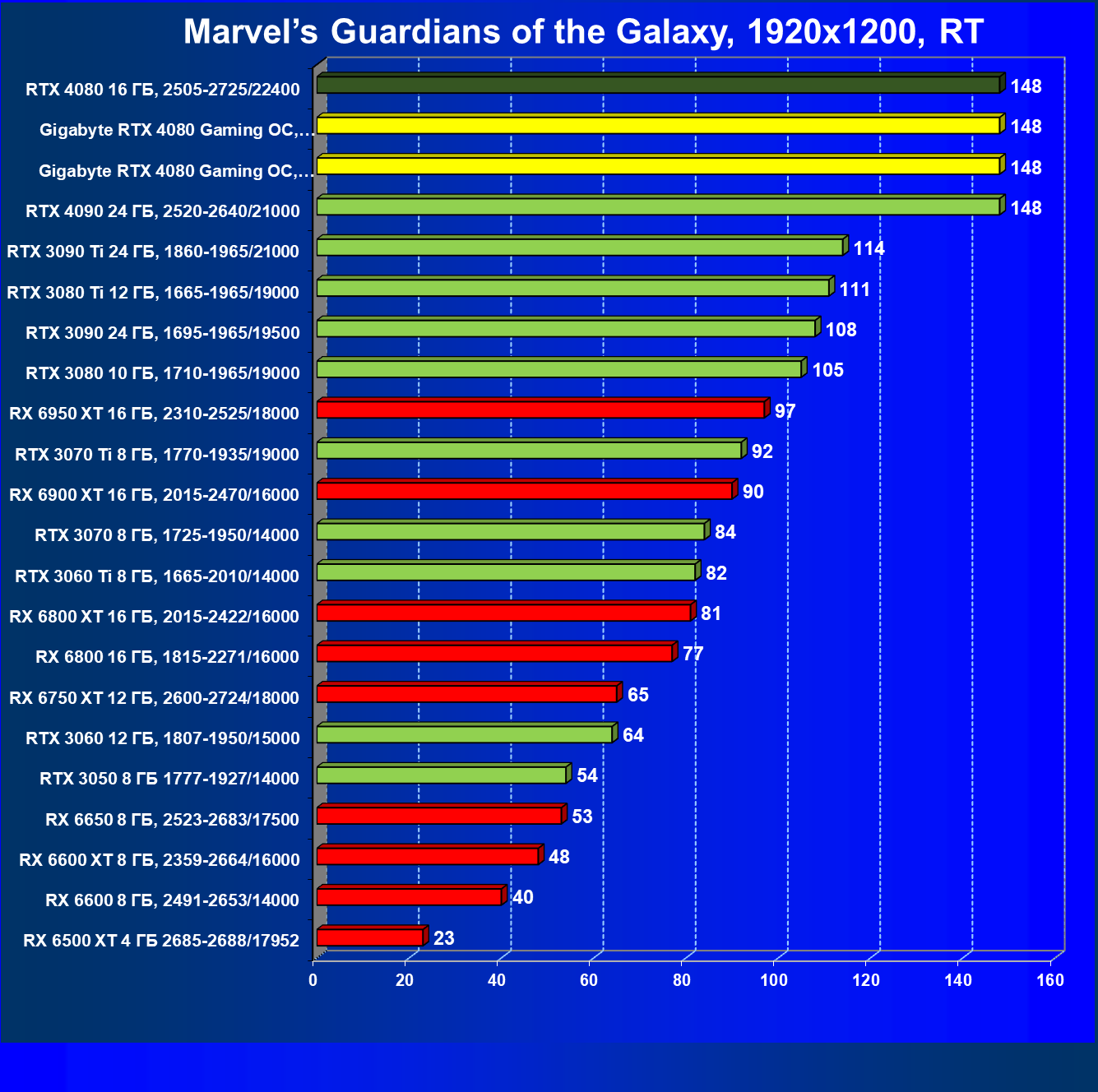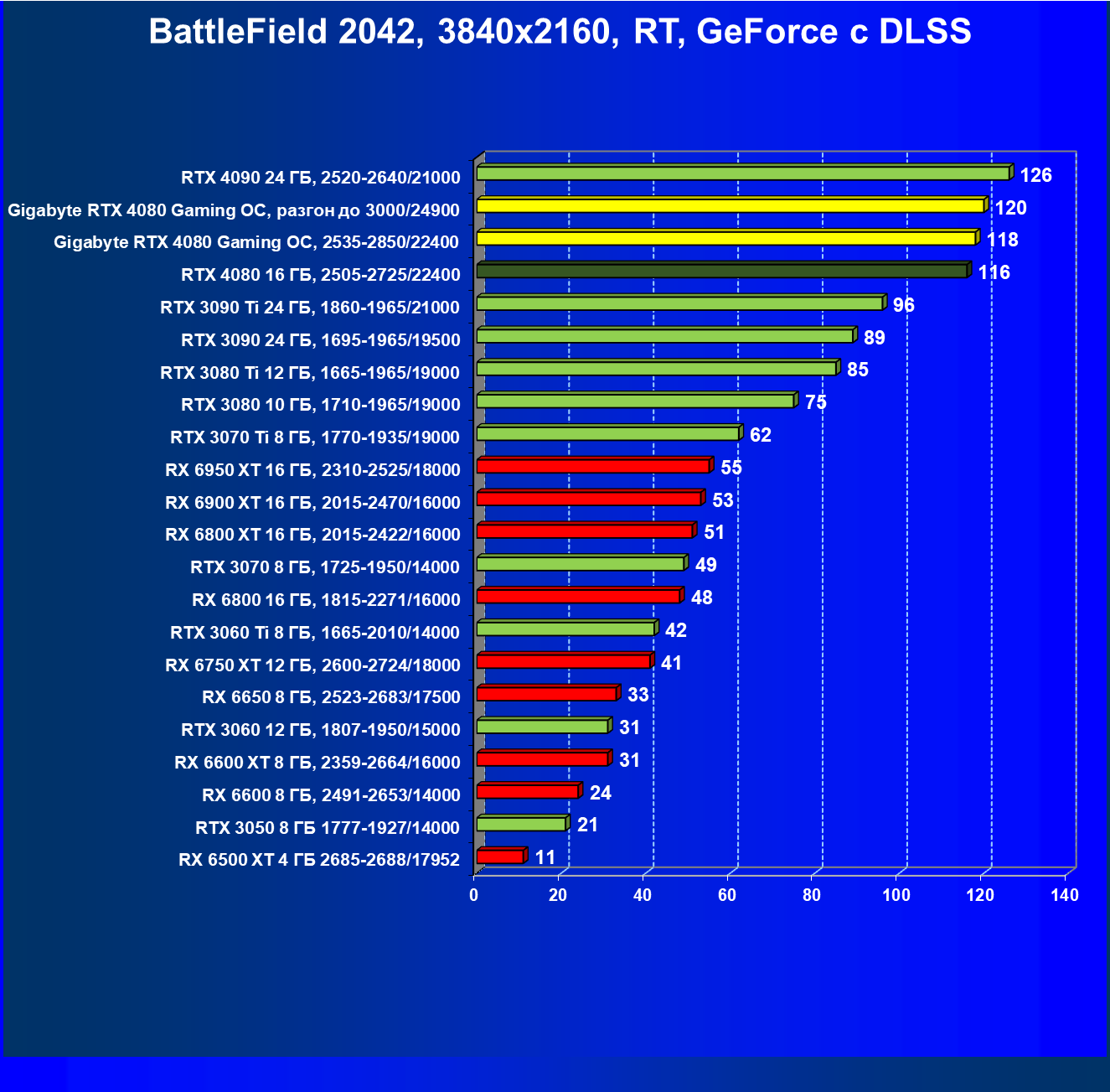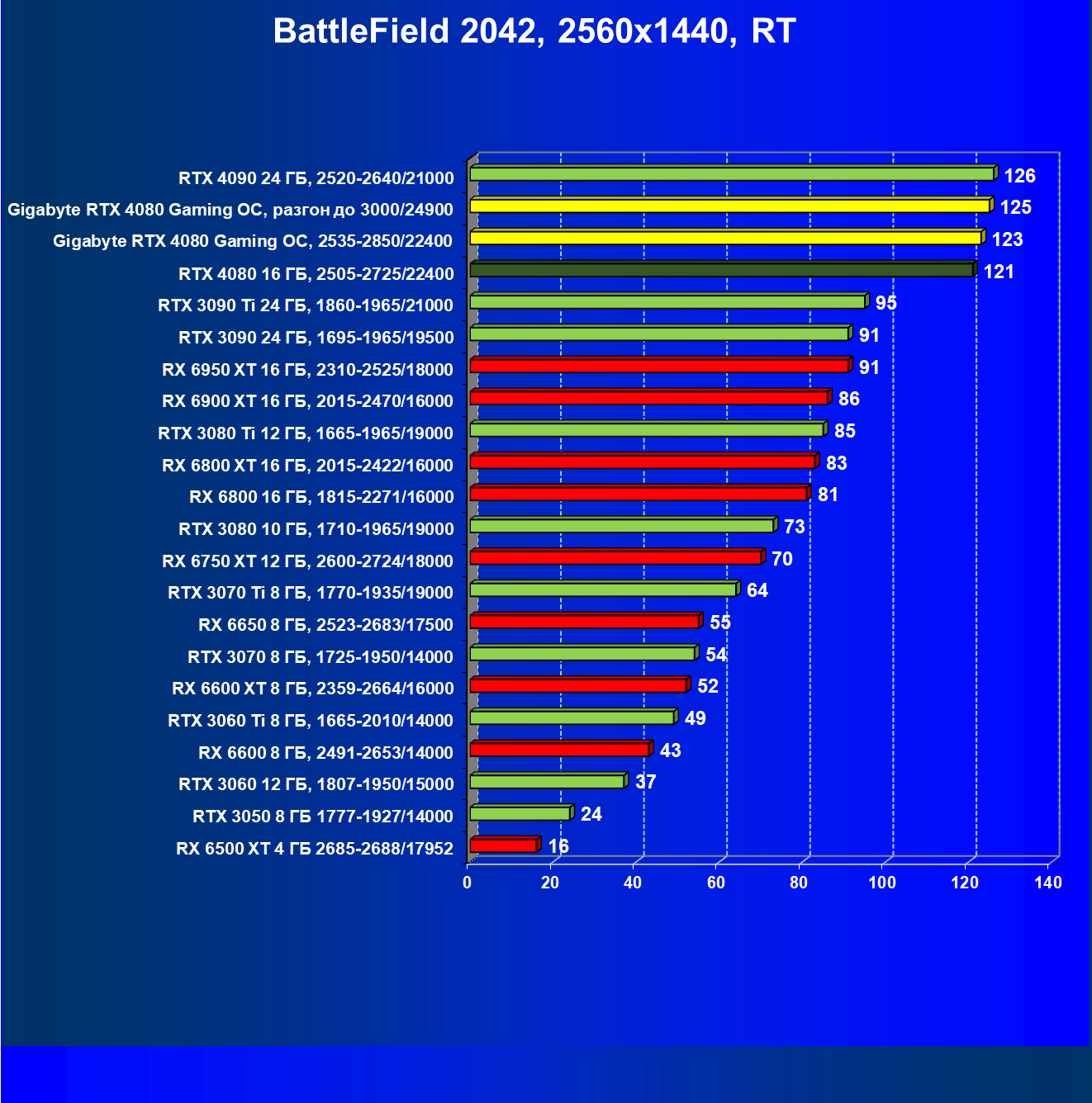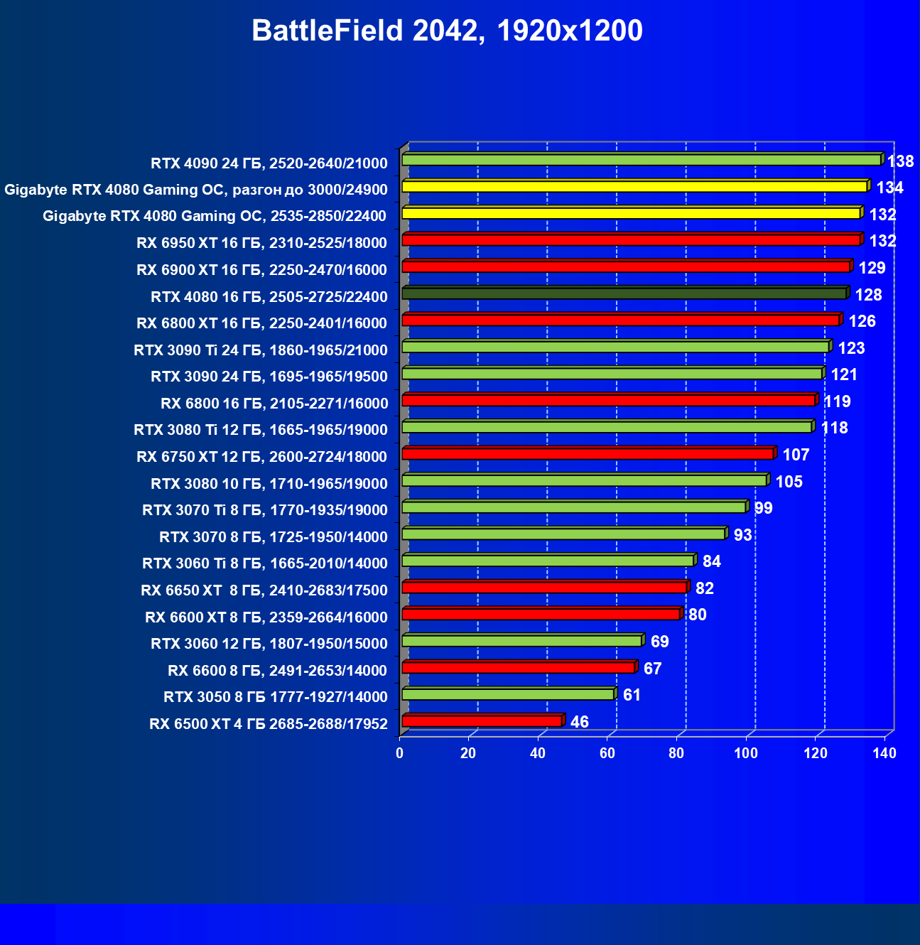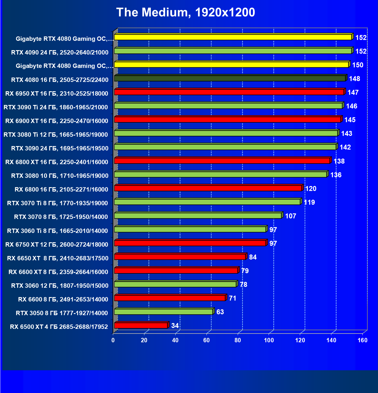 | 20 | Gigabyte RTX 4080 Gaming OC, 2535—2850/22400 | 71 | 837 | 118 000 |