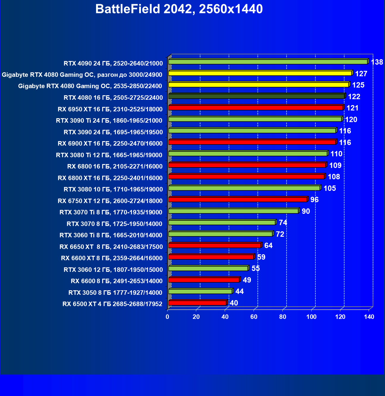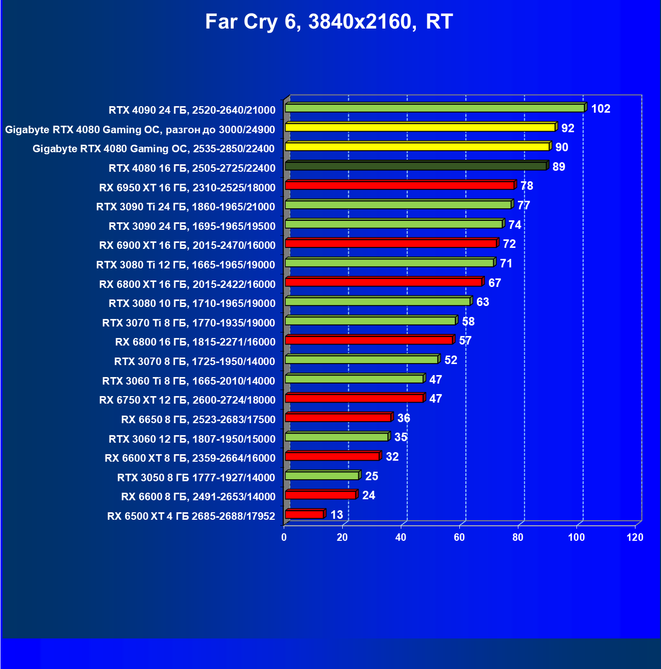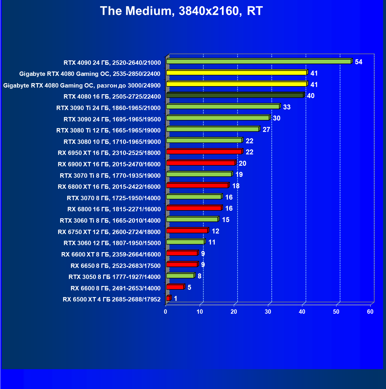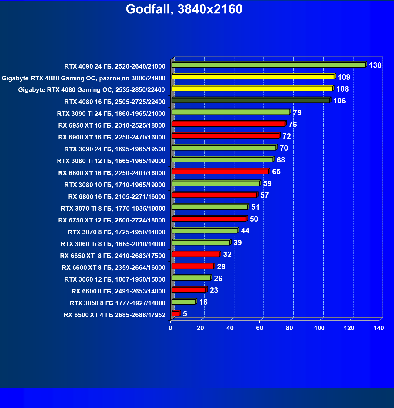 | 20 | Gigabyte RTX 4080 Gaming OC, 2535—2850/22400 | 71 | 837 | 118 000 |