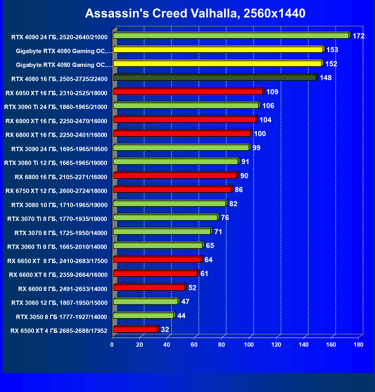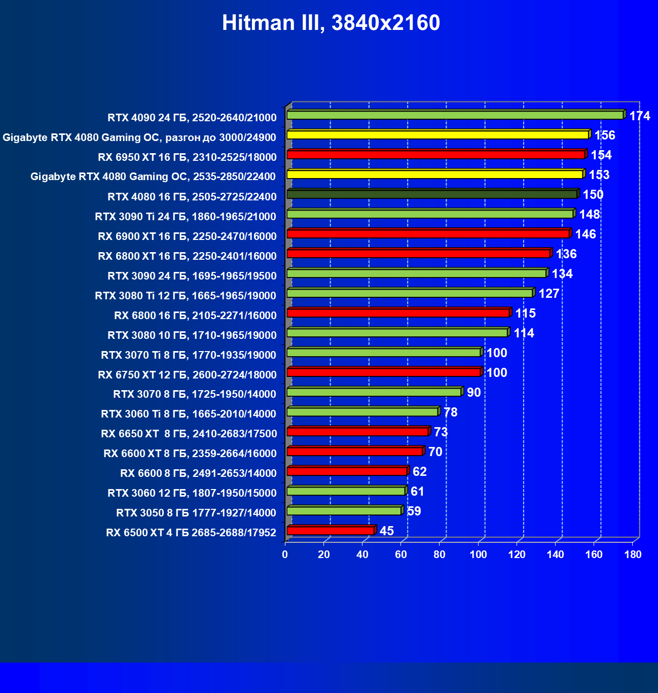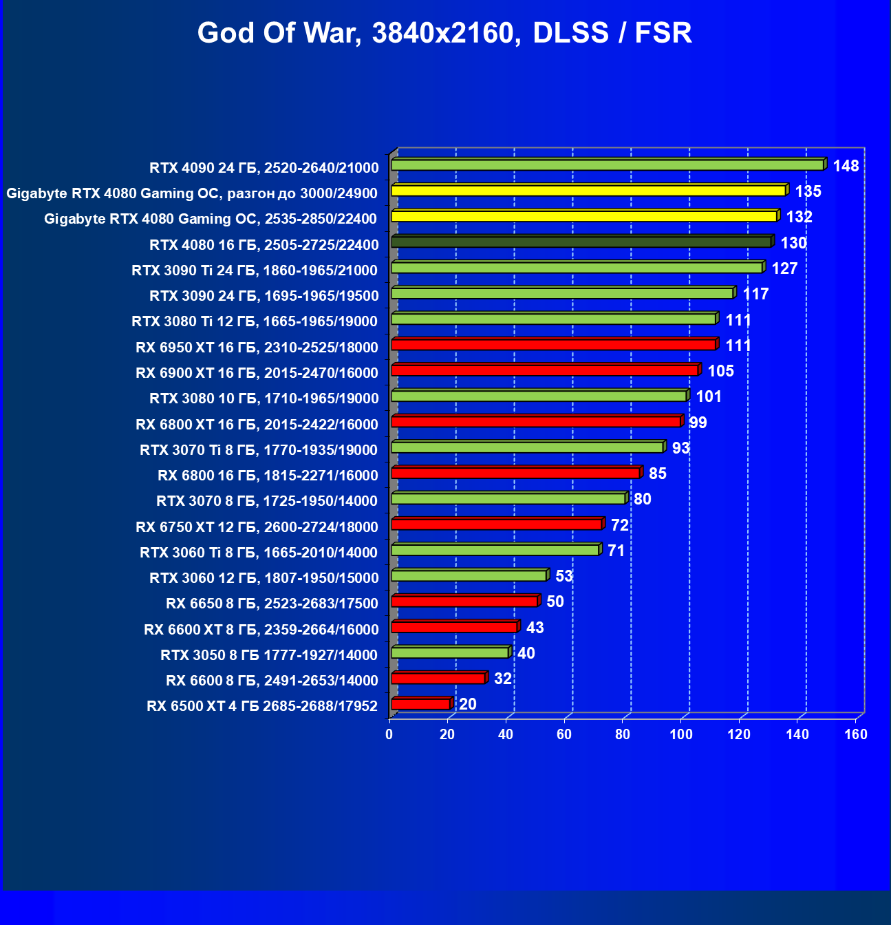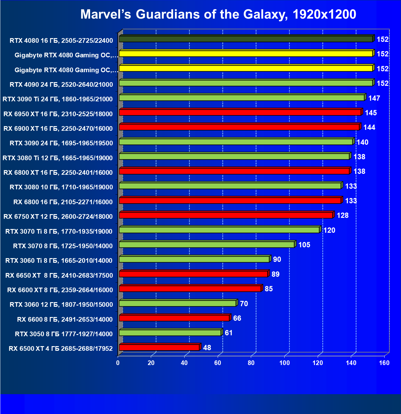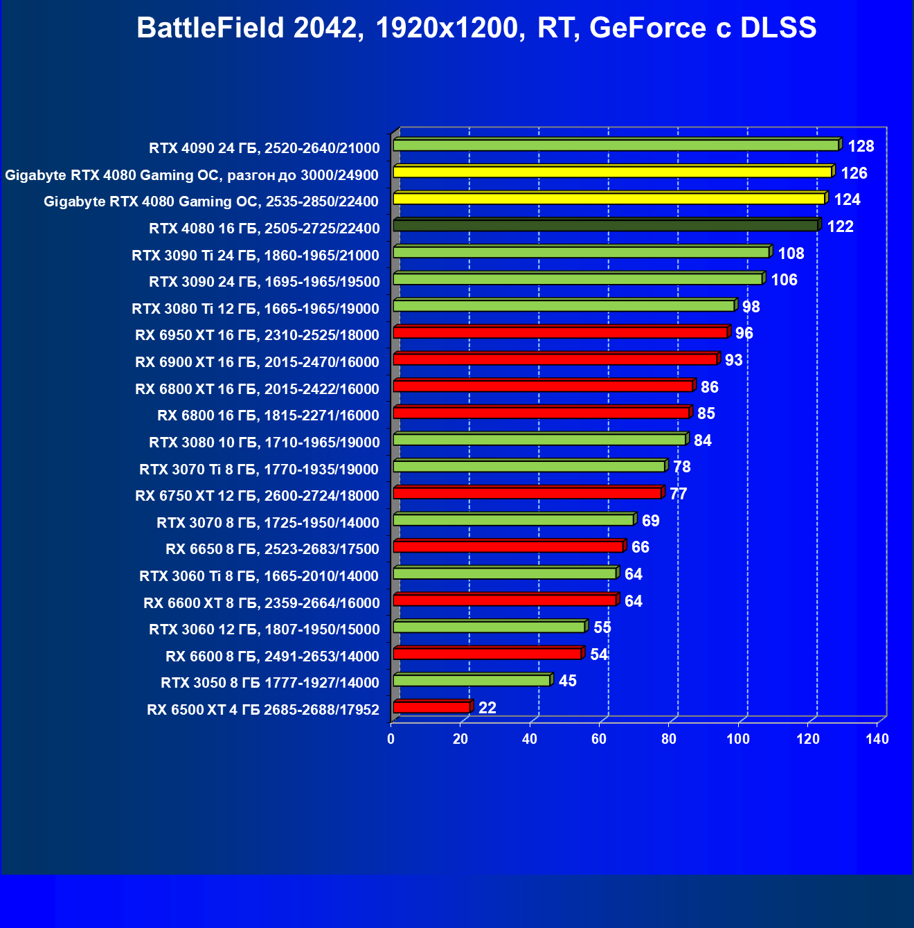 | 20 | Gigabyte RTX 4080 Gaming OC, 2535—2850/22400 | 71 | 837 | 118 000 |