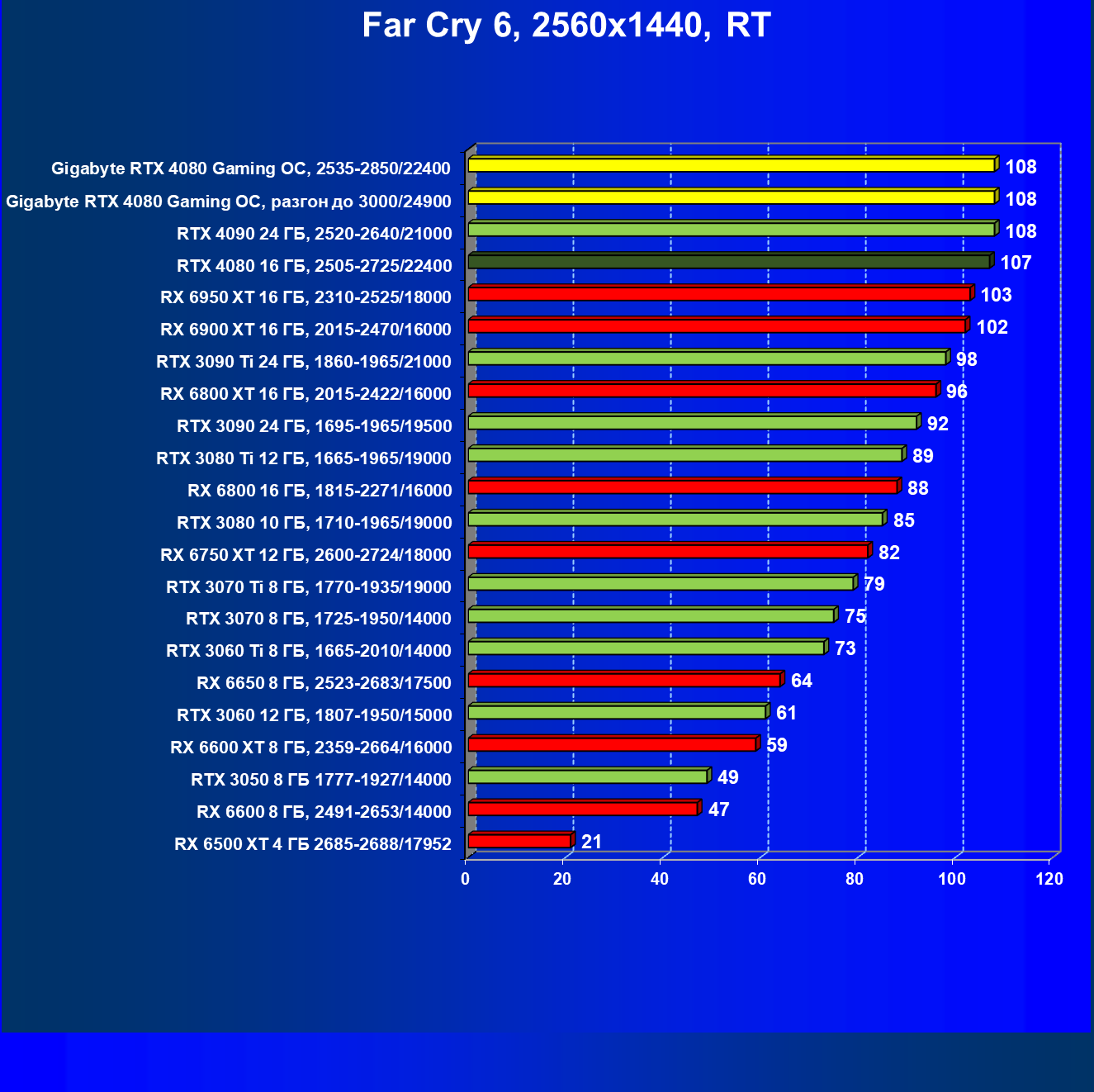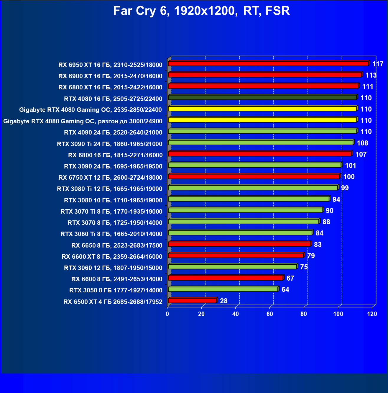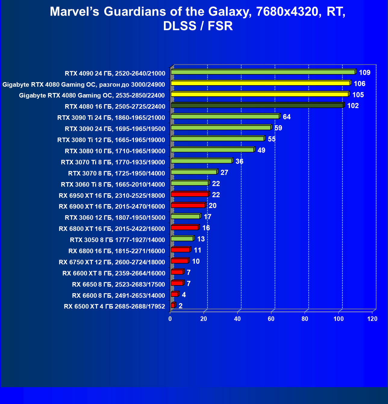 | 20 | RX 6950 XT 16 ГБ, 2310—2525/18000 | 107 | 891 | 83 600 |