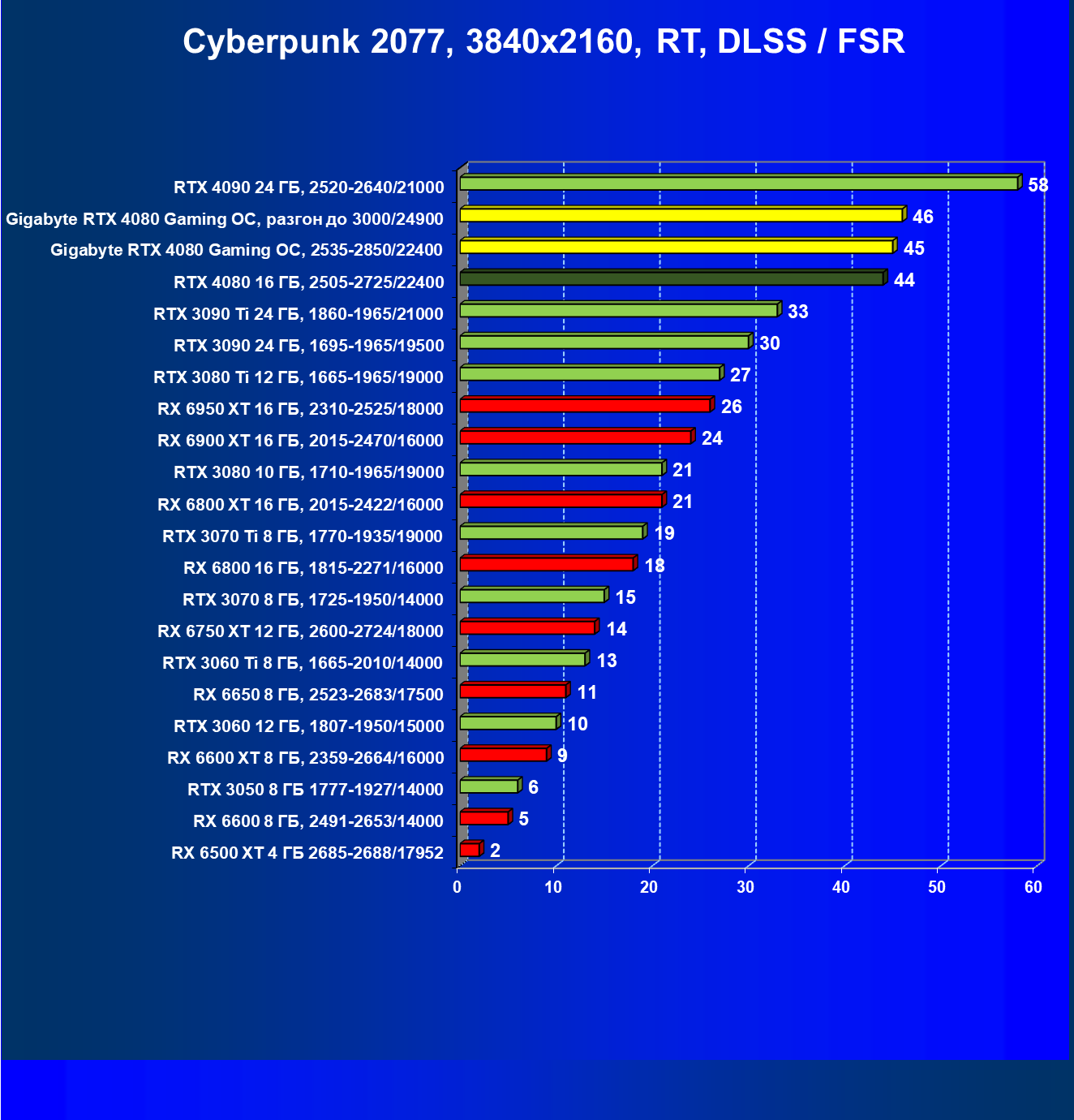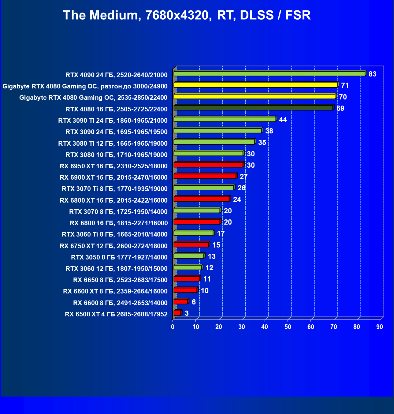 | 09 | RX 6900 XT 16 ГБ, 2250—2470/16000 | 619 | 83 | 75 000 |