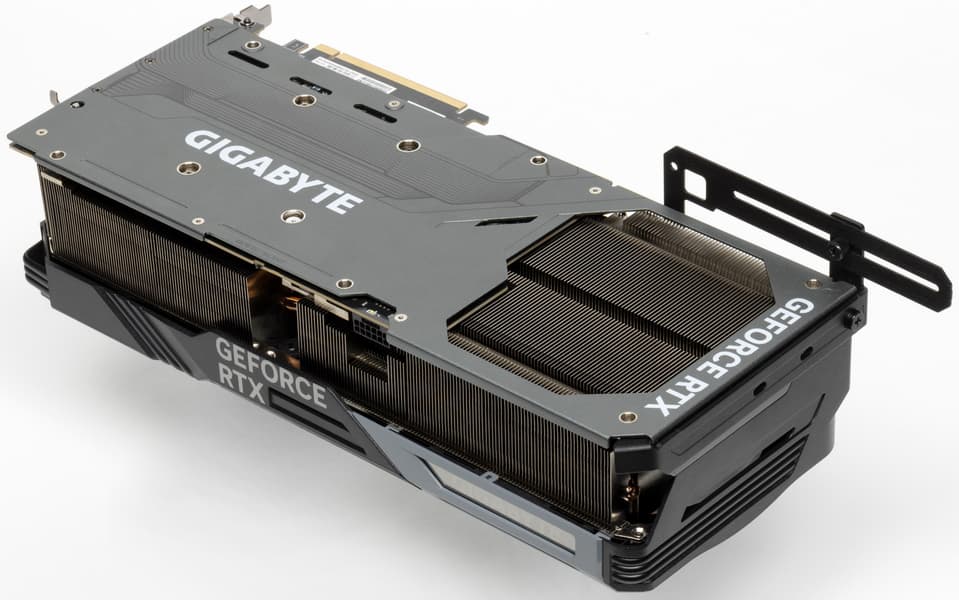 Gigabyte GeForce RTX 4080 Gaming OC 16G (16 ГБ) — очень крупный представитель флагманского ускорителя игрового класса последнего поколения, размеры у карты точно такие же, как у аналогичного продукта на базе GeForce RTX 4090. Видеокарта потребляет не более 350 Вт, поэтому опасения насчет перегрева 16-контактного разъема в данном случае излишни, однако все равно рекомендуется иметь хороший мощный блок питания. Система охлаждения сравнительно тихая. Видеокарта снабжается кронштейном, с помощью которого ее хвостовая часть жестко крепится к корпусу ПК, что гарантирует отсутствие провисания тяжелой карты. Габариты этой модели составляют 34 см в длину и 15 см в высоту, а по ширине видеокарта занимает 4 слота в корпусе.