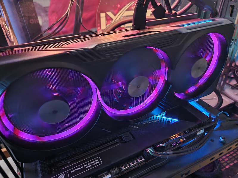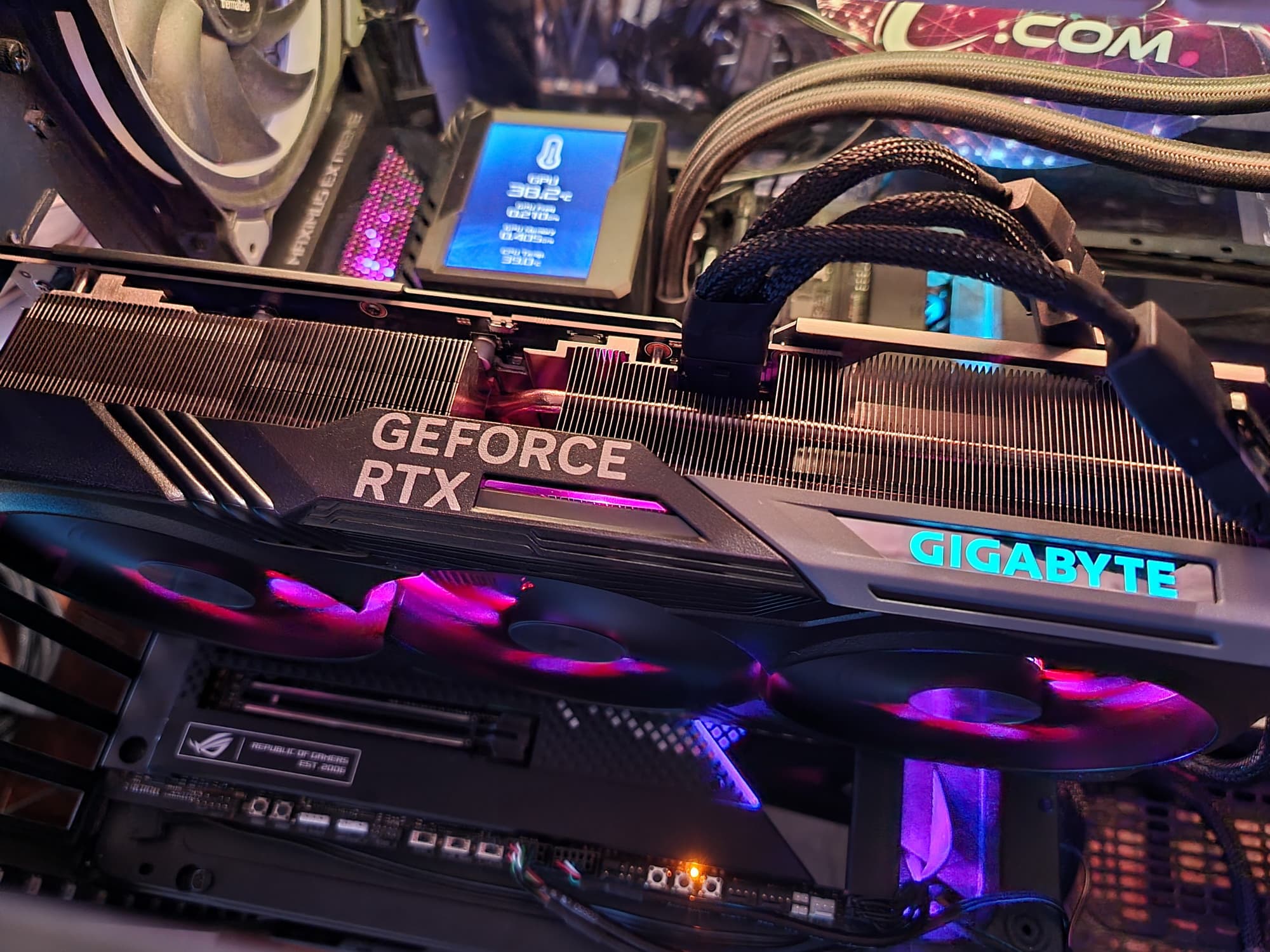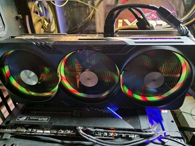 Карта Gigabyte имеет стандартный 16-контактный разъем питания версии PCIe 5.0. Несмотря на то, что в комплекте поставки имеется адаптер-переходник для подключения разъемов питания типа PCIe 2.0 (на 3 таких разъема), лучше все же использовать блоки питания стандарта ATX 3.0 с полноценной поддержкой питания стандарта PCIe 5.0 (с кабелем 12VHPWR). Имеющийся же переходник питания ни в коем случае нельзя изгибать непосредственно после 16-контактного разъема. Также стоит отметить подсветку вентиляторов только при их вращении, которая смотрится очень эффектно. К сожалению, при синхронизации подсветки с материнскими платами Gigabyte набор эффектов резко сокращается до простых и неинтересных.