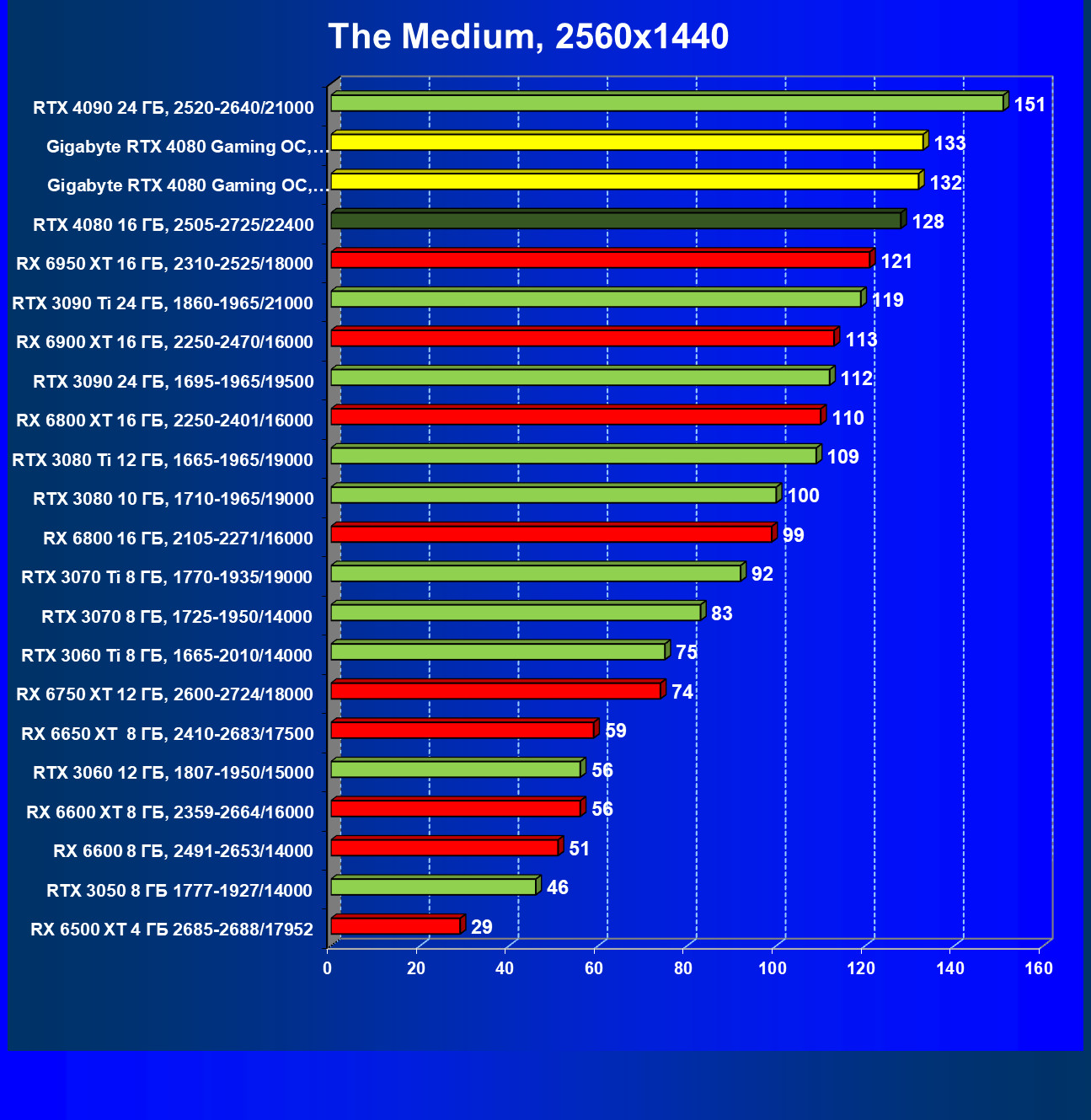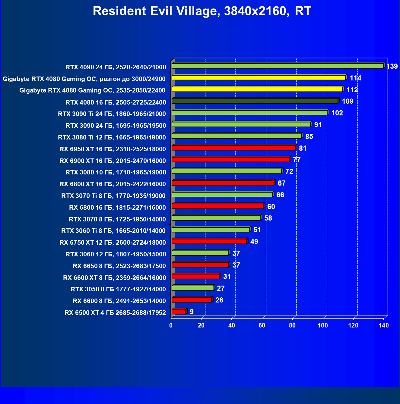 Почти все вышесказанное справедливо и здесь, за исключением того, что флагманы AMD оказались аутсайдерами, да и вообще сейчас уже нет смысла в приобретении таких карт. Прекрасно видно, что из-за чрезмерно завышенных цен RTX 4080 выигрывает только у Radeon RX 6950/6900 XT.