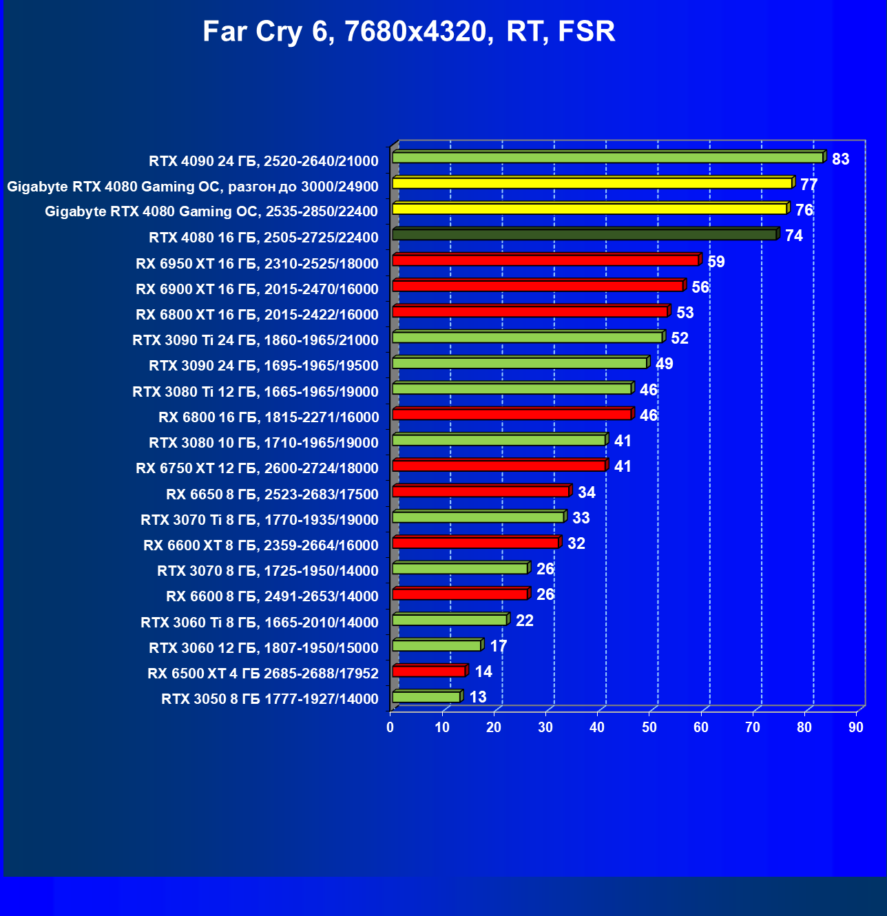 | 16 | RX 6950 XT 16 ГБ, 2310—2525/18000 | 81 | 675 | 83 600 |