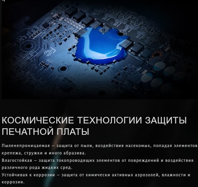 Производитель декларирует просто фантастический уровень защиты печатной платы. Проверять влагостойкость и устойчивость к коррозии мы по понятным причинам не стали, а для проверки защиты от пыли нужно время.