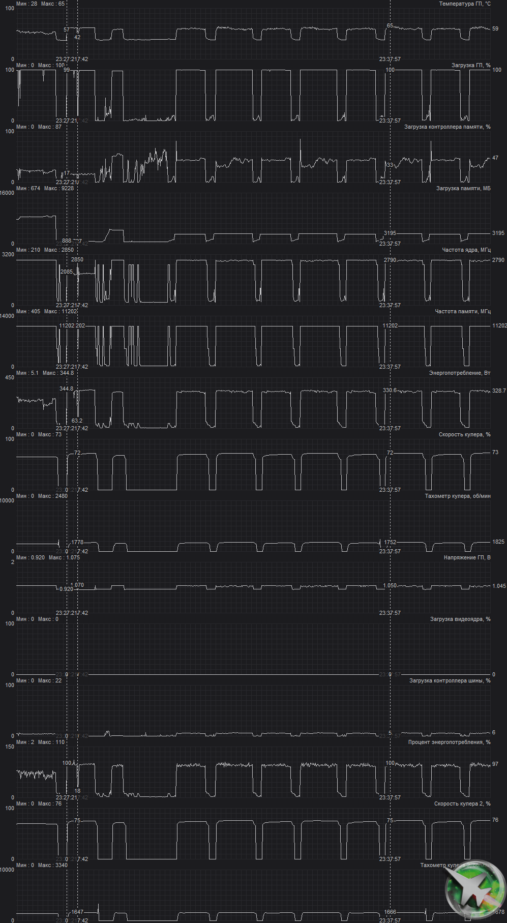 После 2-часового прогона под нагрузкой максимальная температура ядра не превысила 65 градусов, а температура микросхем памяти — 68 градусов, что является просто великолепным результатом для видеокарт флагманского уровня! Энергопотребление карты доходило до 345 Вт. Напомним, что безопасный предел нагрева памяти GDDR6X — 105 °C.