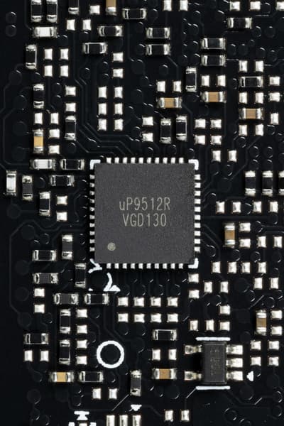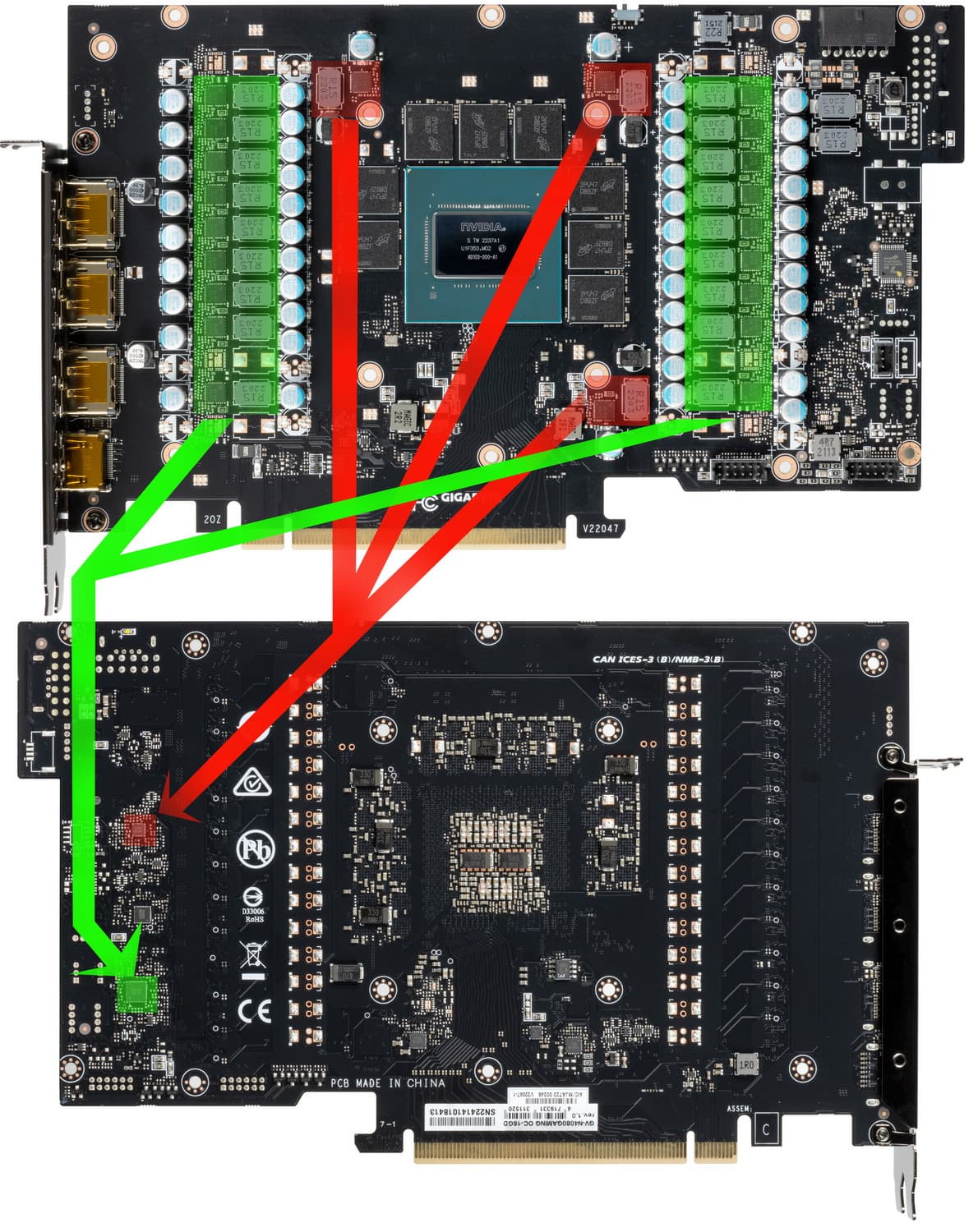 Зеленым цветом отмечена схема питания ядра, красным — памяти. Все контроллеры расположены на оборотной стороне PCB. Фазами питания ядра управляет ШИМ-контроллер uP9512R (максимум 8—12 фаз в зависимости от модификации).