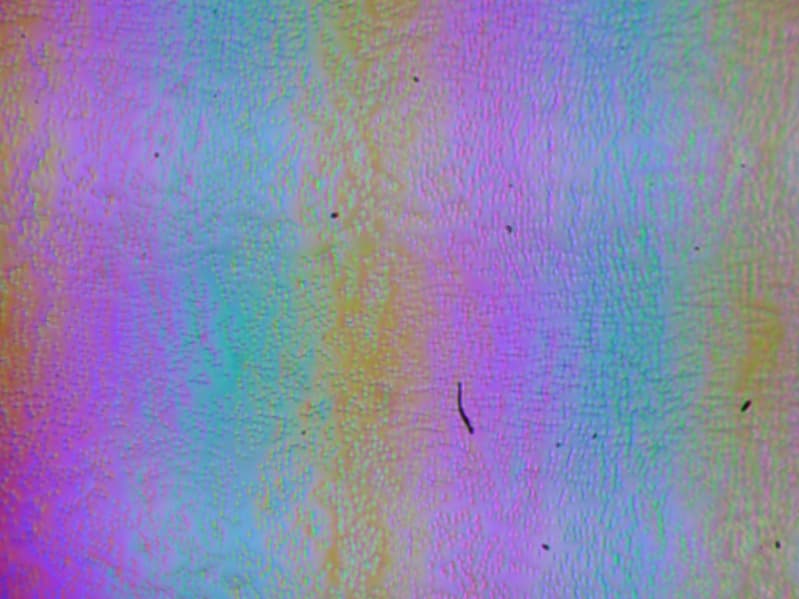 Зерно этих дефектов в несколько раз меньше размеров субпикселей (масштаб этих двух фотографий одинаковый), поэтому фокусировка на микродефектах и «перескок» фокуса по субпикселям при изменении угла зрения выражены слабо, из-за этого нет и «кристаллического» эффекта.
