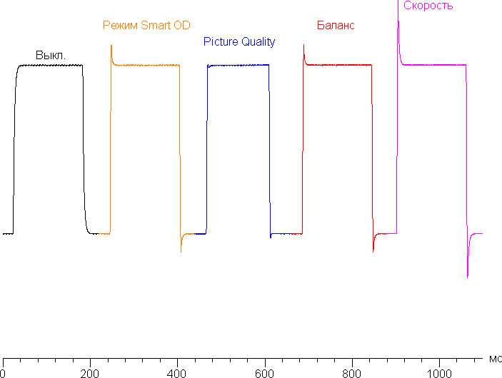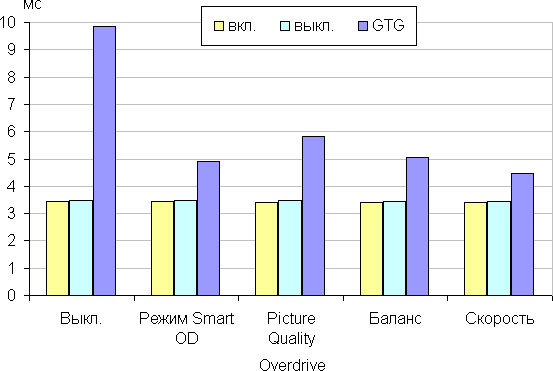 Время отклика зависит от значения настройки Overdrive (ошибочно переведенной как Увеличить масштаб), которая управляет разгоном матрицы. Доступно пять значений этой настройки. Диаграмма ниже показывает, как меняется время включения и выключения при переходе черный-белый-черный (столбики «вкл.» и «выкл.»), а также среднее суммарное время для переходов между полутонами (столбики GTG) в случае режима с частотой обновления 320 Гц: