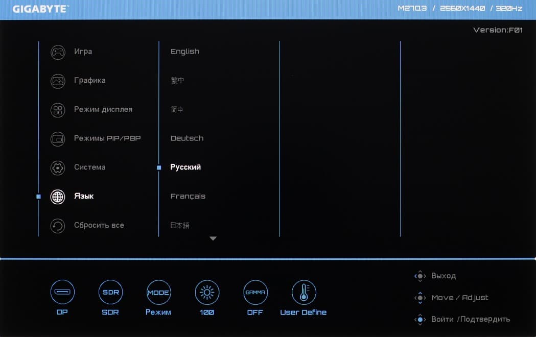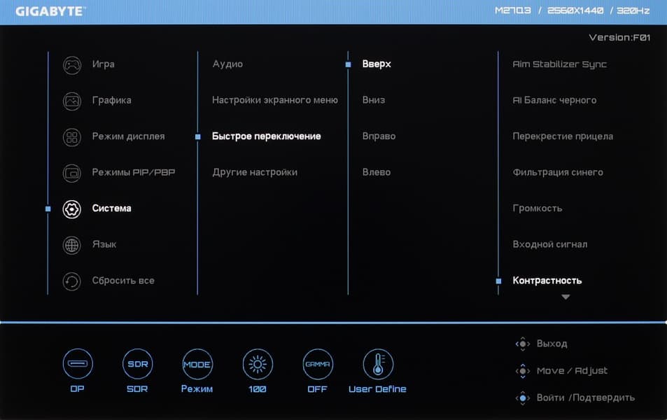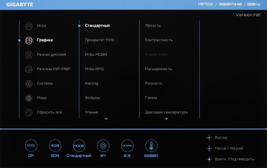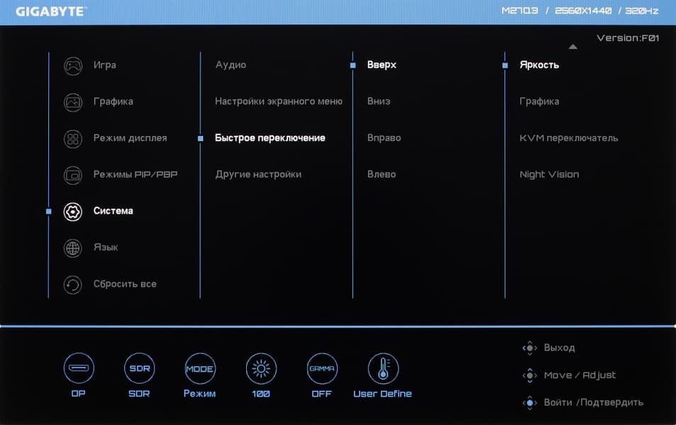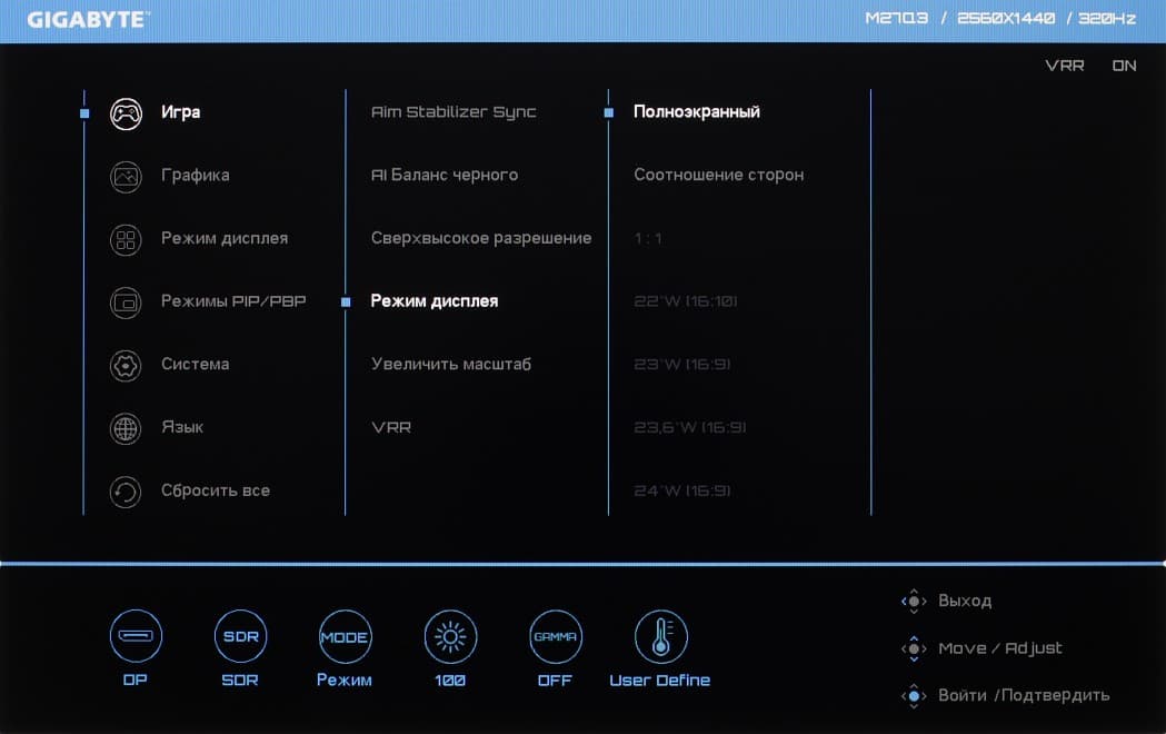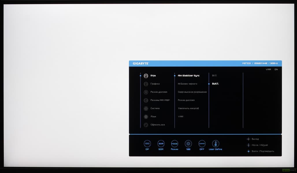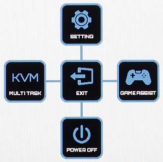 Если на экране оно, то нажатие на джойстик — выход из меню, отклонение вниз — выключение монитора (его можно выключить и без меню длительным нажатием на джойстик), вверх — вход в основное меню установок, вправо — меню с настройками игровых функций, влево — меню KVM.