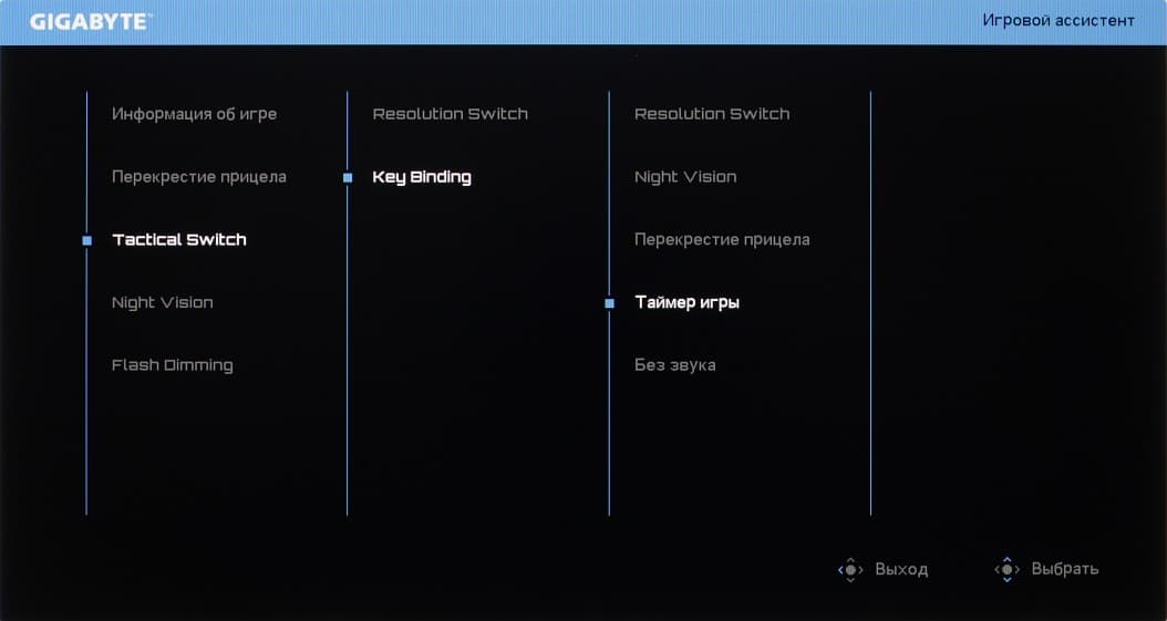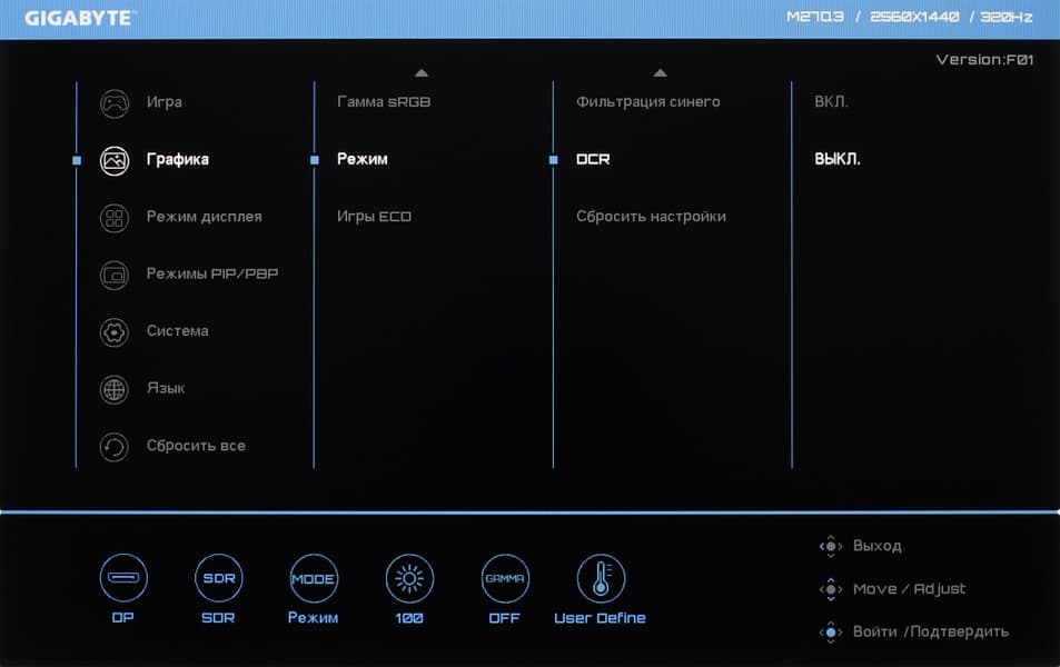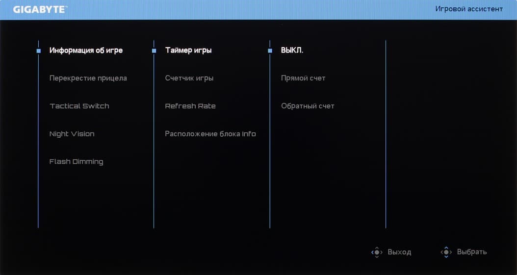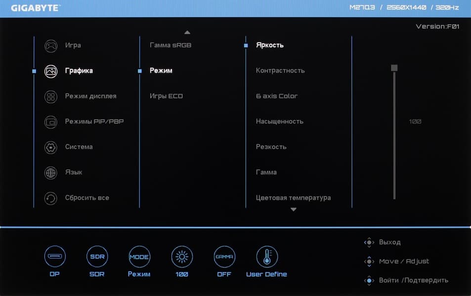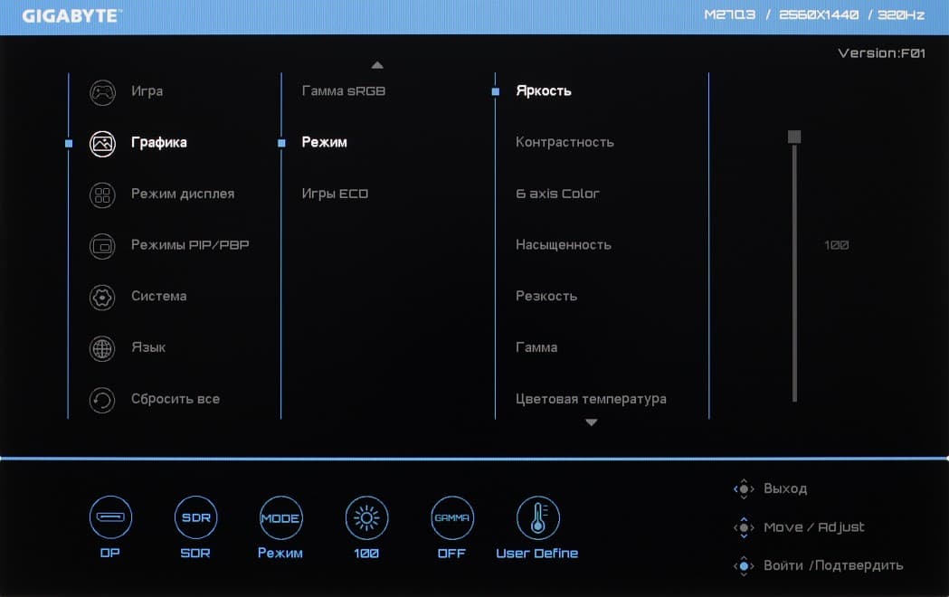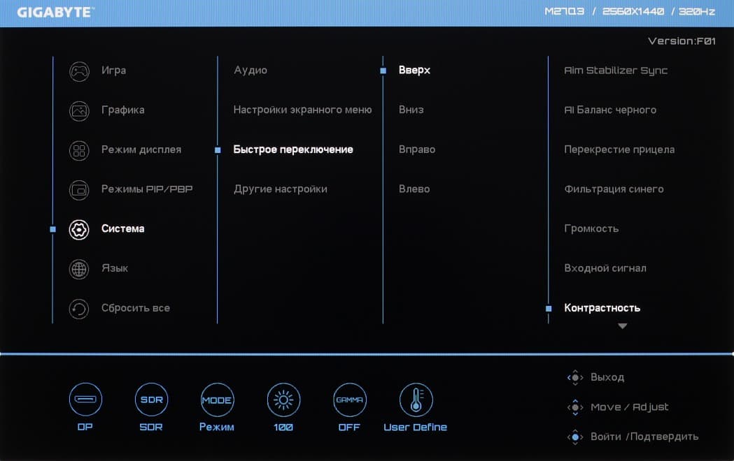 Если на экране оно, то нажатие на джойстик — выход из меню, отклонение вниз — выключение монитора (его можно выключить и без меню длительным нажатием на джойстик), вверх — вход в основное меню установок, вправо — меню с настройками игровых функций, влево — меню KVM.