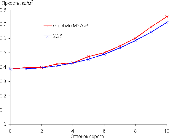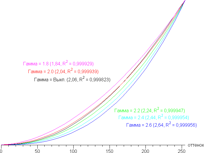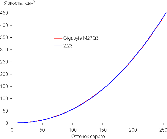 Аппроксимация полученной гамма-кривой дала показатель 2,23, что близко к стандартному значению 2,2, при этом реальная гамма-кривая мало отклоняется от аппроксимирующей степенной функции: