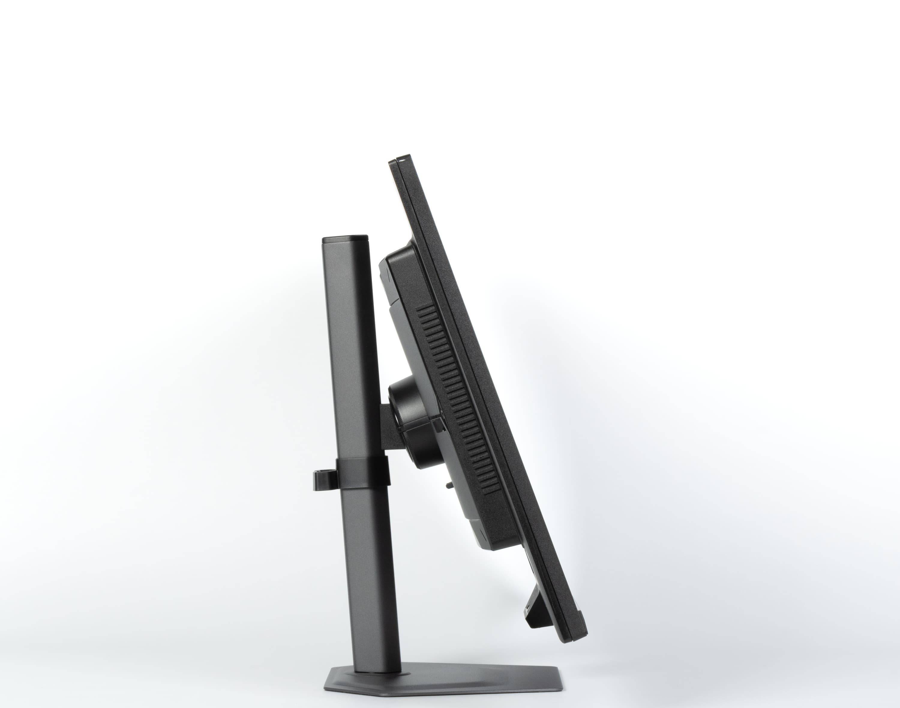 Стойка имеет фиксированную высоту, но подпираемый пружиной механизм со стальным рельсовым шариковым подшипником обеспечивает вертикальное перемещение узла, на который крепится блок экрана. В итоге легким движением руки экран можно установить на нужную высоту. Штатная подставка позволяет немного наклонять блок экрана вперед от вертикального положения и больше — назад, а также переворачивать в портретную ориентацию по часовой стрелке.