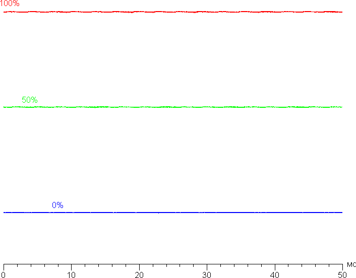 Яркость монитора меняется именно яркостью подсветки, то есть без ущерба для качества изображения (сохраняется контрастность и количество различимых градаций) яркость монитора можно менять в широких пределах, что позволяет с комфортом играть, работать и смотреть фильмы как в освещенном, так и в темном помещении, хотя для последнего случая минимальная яркость кому-то может показаться высоковатой. На любом уровне яркости значимая модуляция подсветки отсутствует, что исключает видимое мерцание экрана. Для тех, кто привык распознавать знакомое сокращение, уточним: ШИМ отсутствует. В доказательство приведем графики зависимости яркости (вертикальная ось) от времени (горизонтальная ось) при различных значениях настройки яркости: